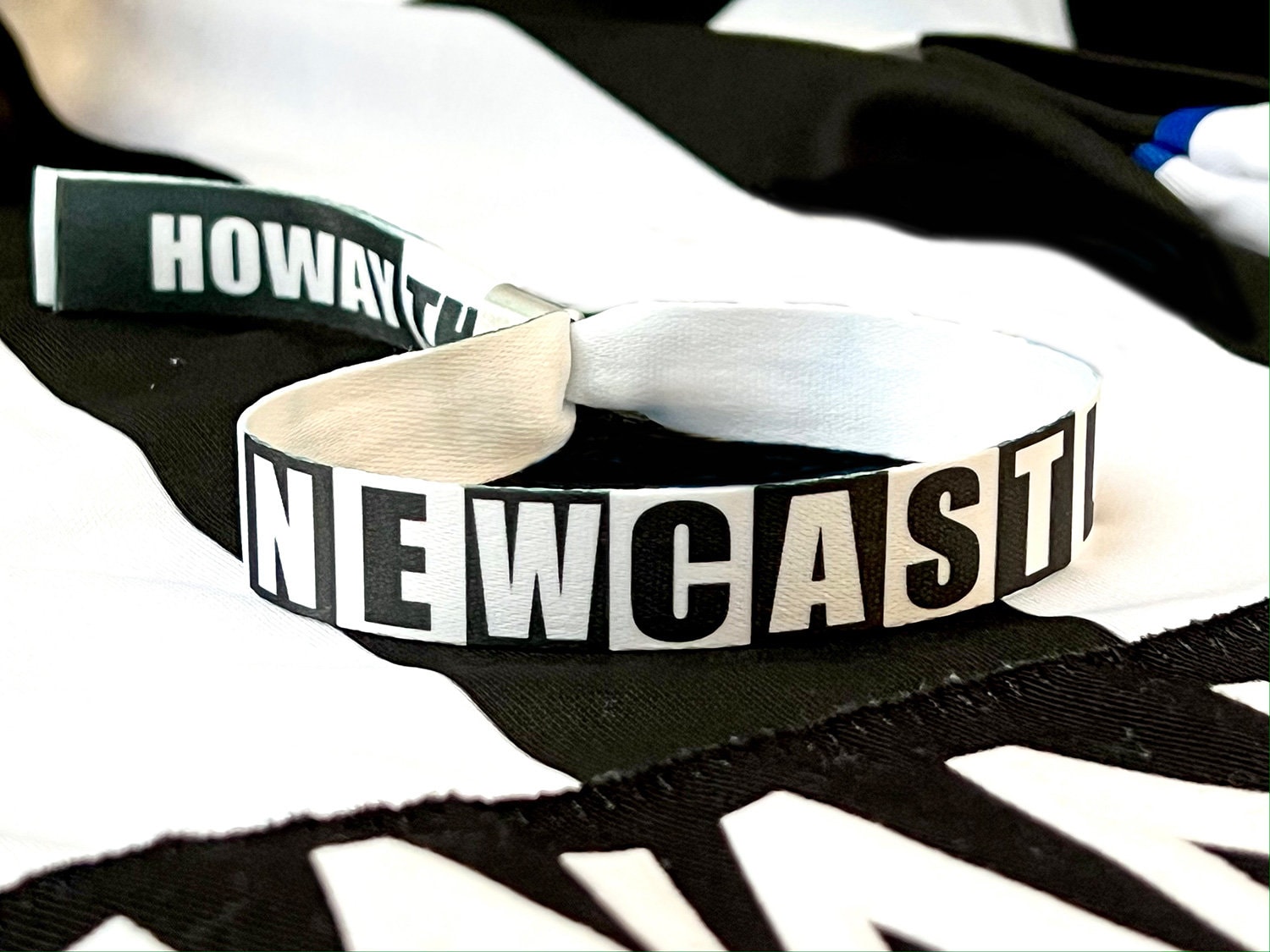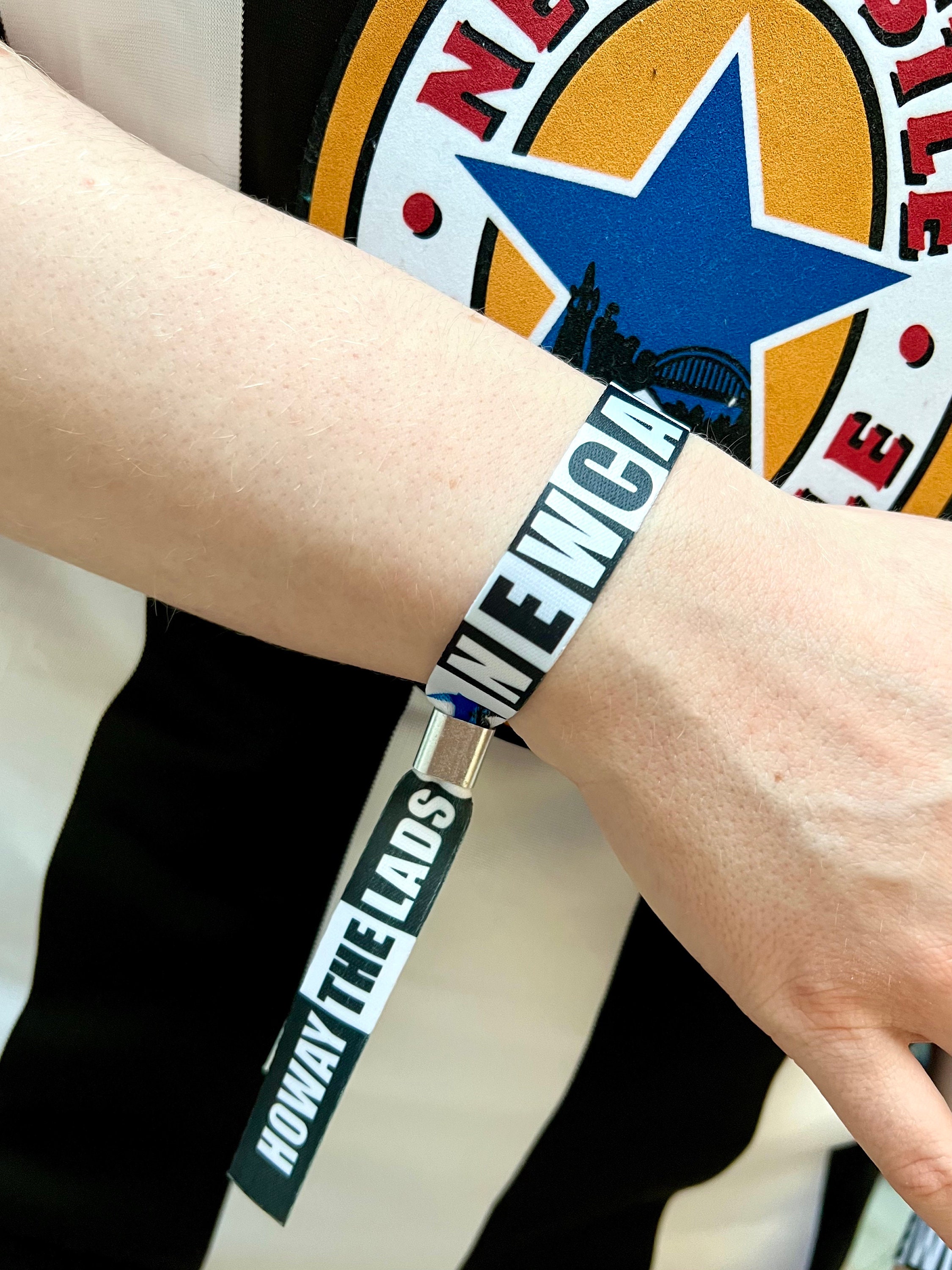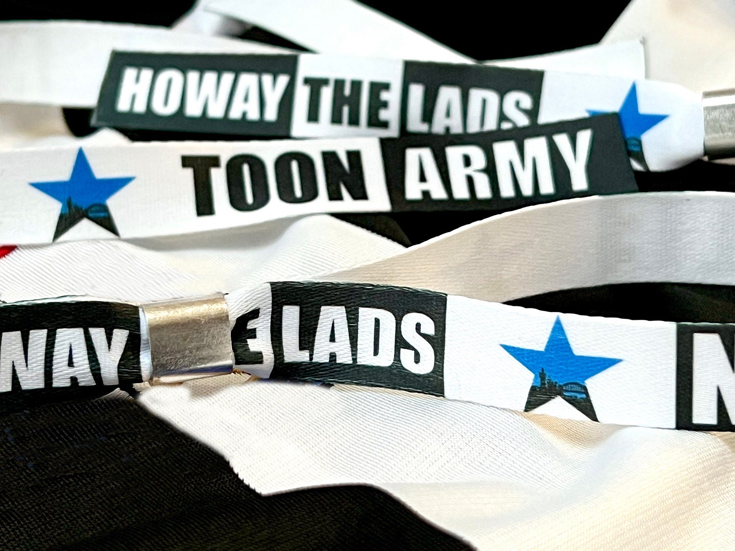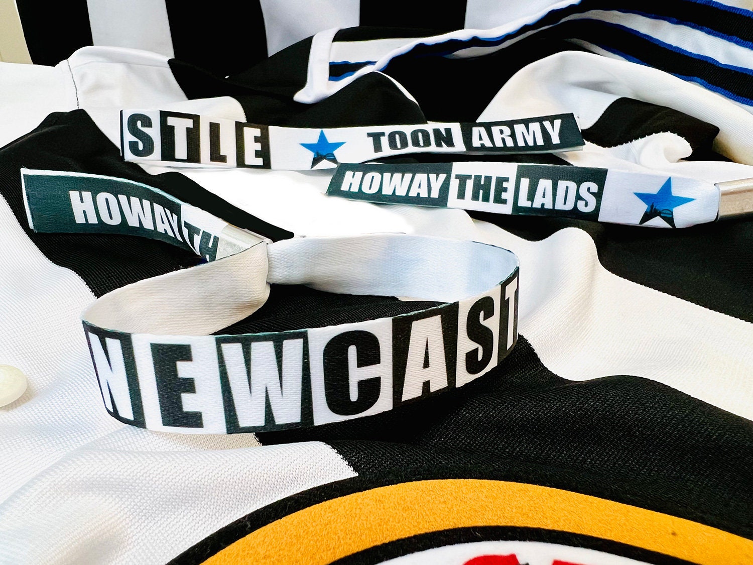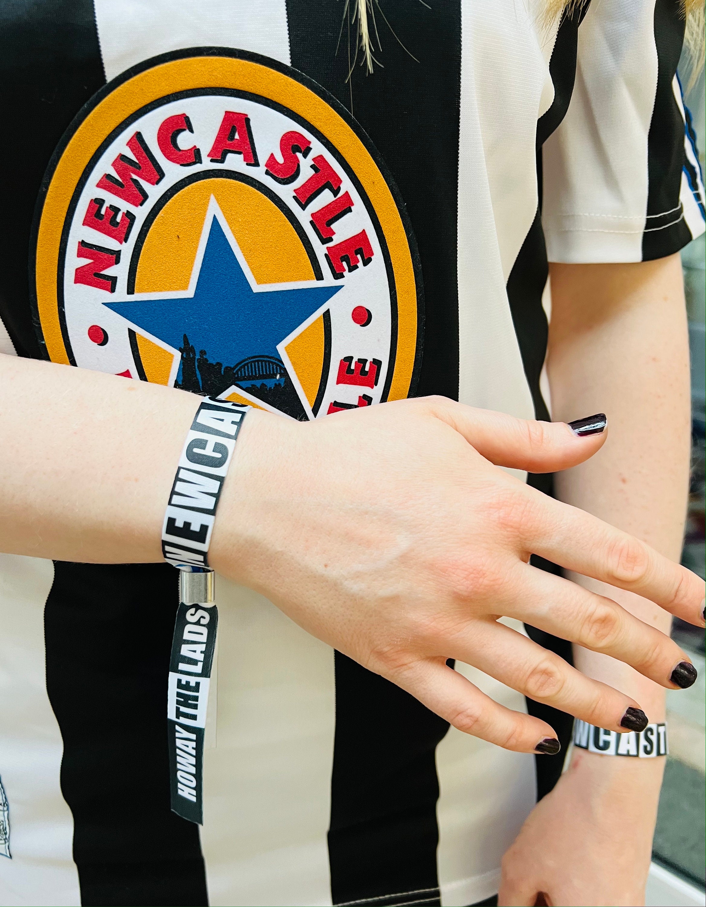 These super cool looking wristbands have NEWCASTLE as the main text on a black and white background with HOWAY THE LADS on one tail and TOON ARMY on the other.