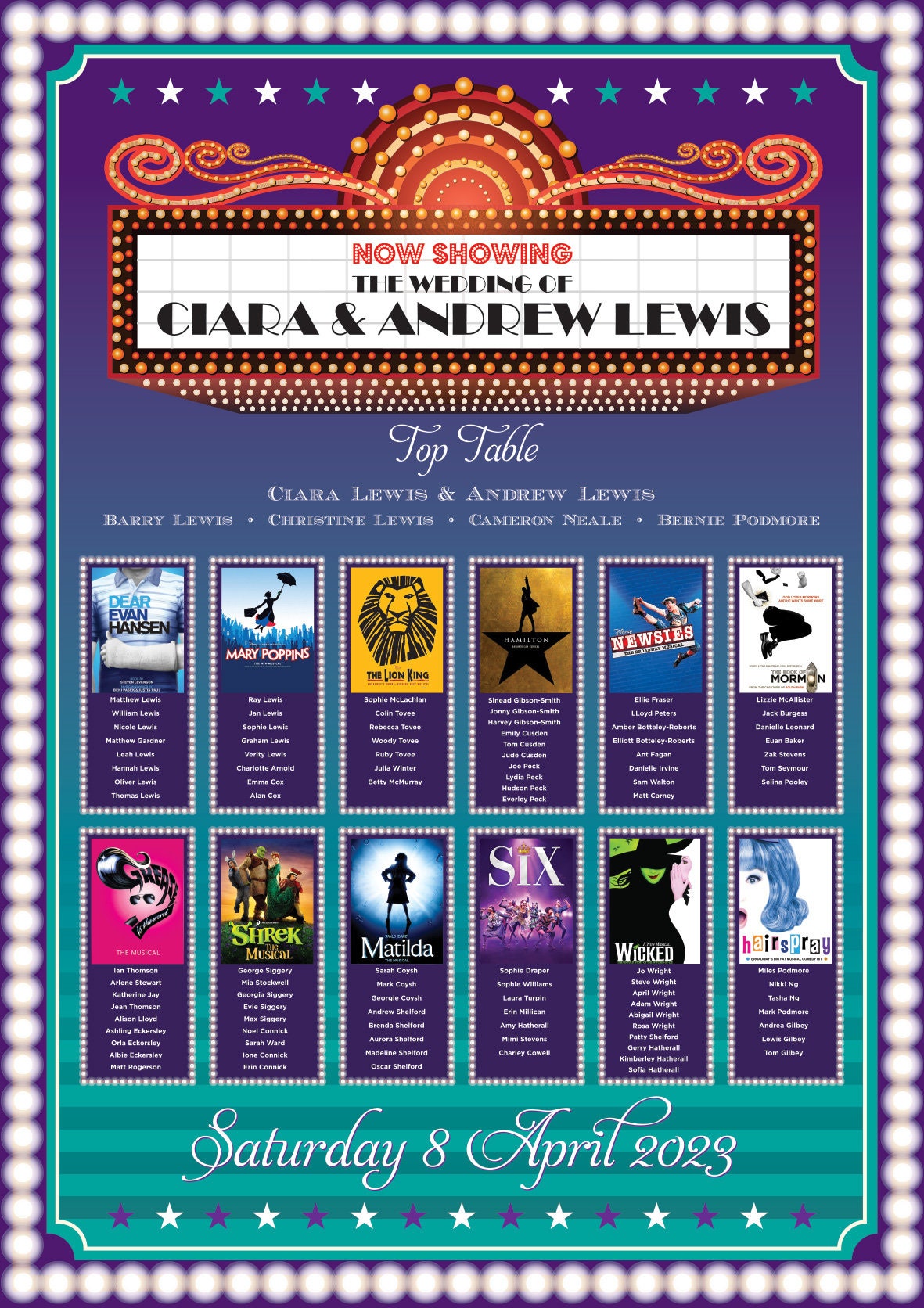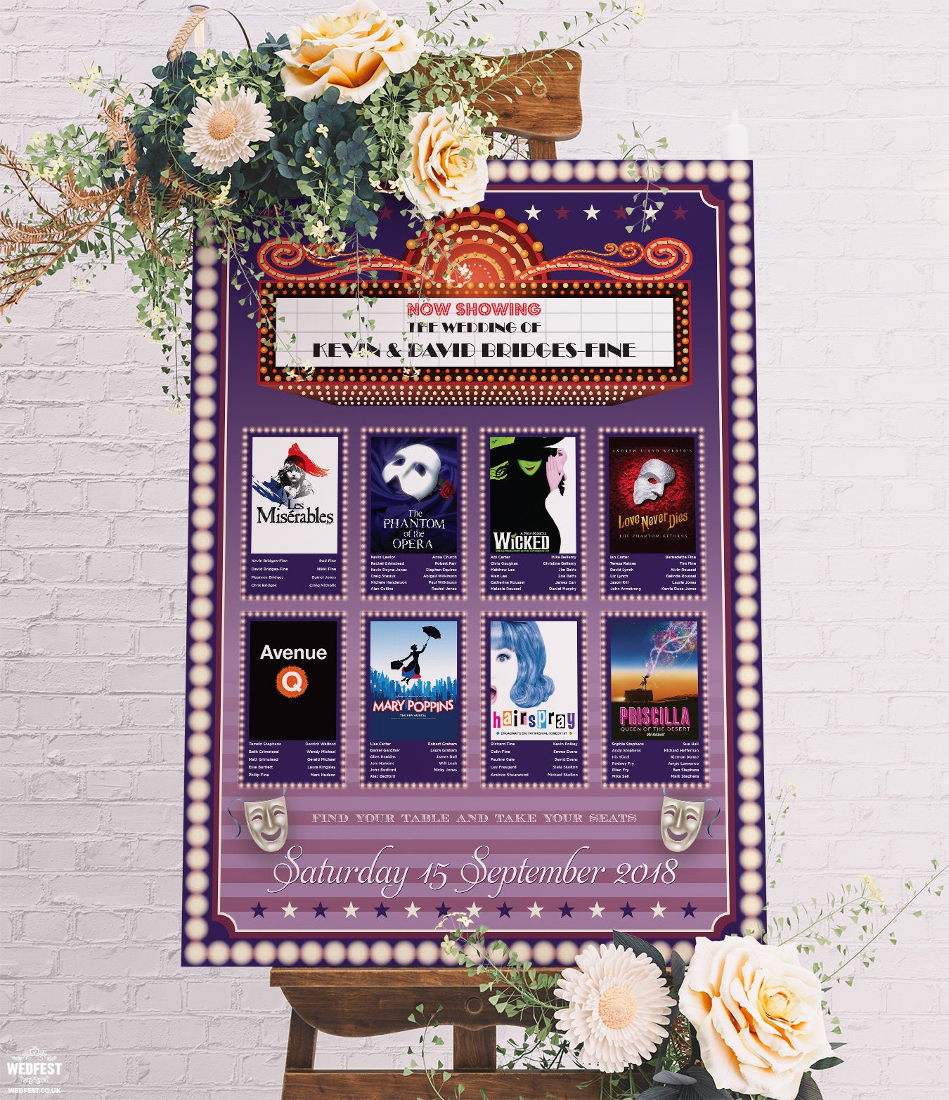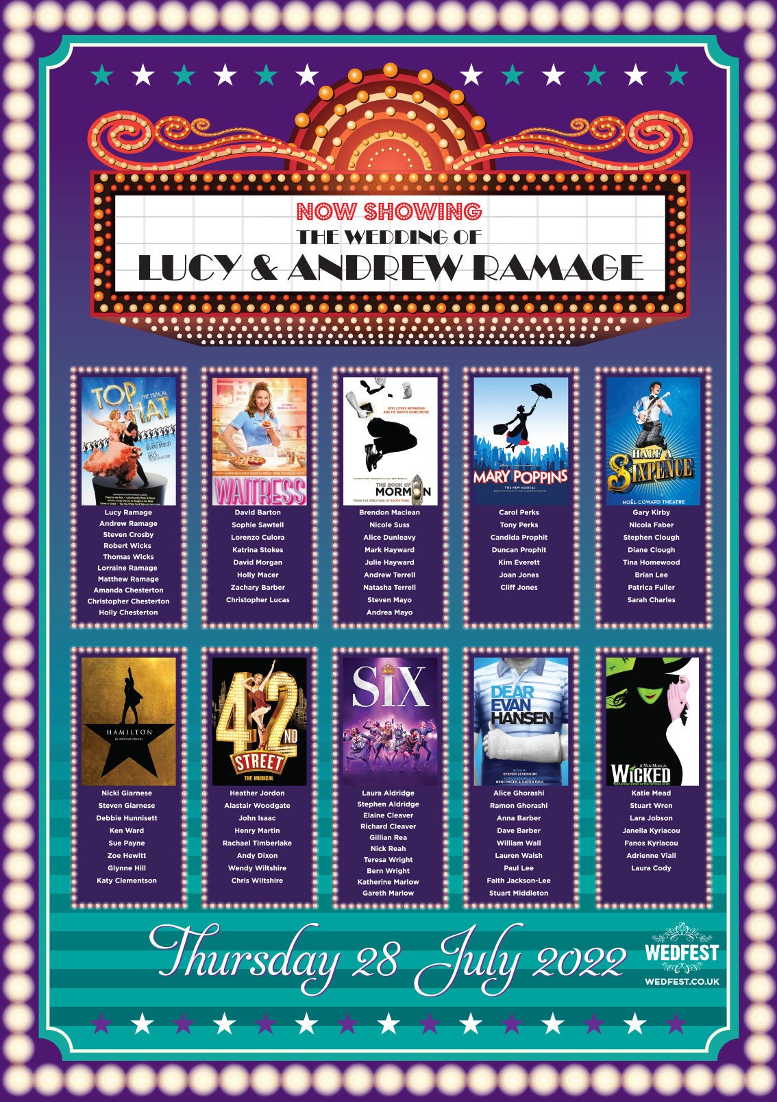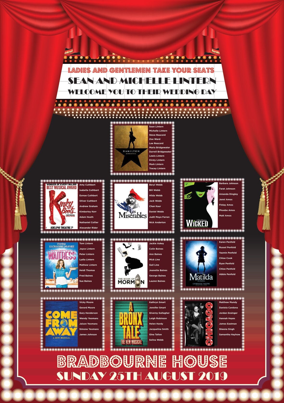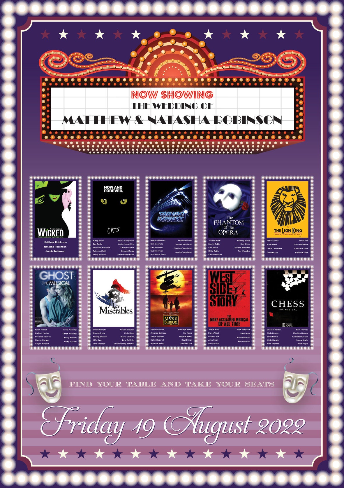 These Musical Theatre Theme Wedding Table Plans are perfect for anyone who loves the theatre, west end or broadway or are having a movie themed wedding or anyone who just wants to add a bit of fun to their wedding. The samples you see here are just a few of the options I offer so before you commit to buying visit my website and view some of the other designs I offer or if you want something unique to you thats also possible...
