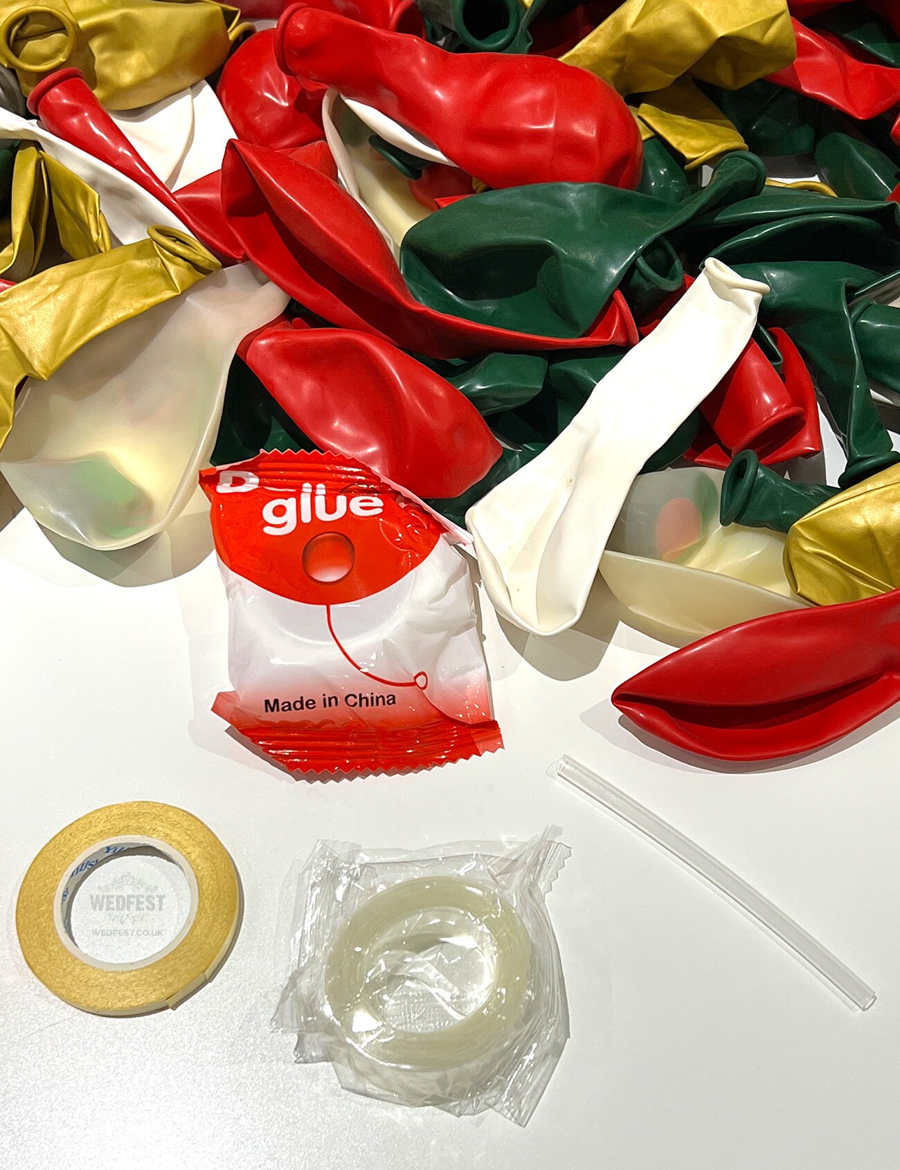 Accessories include balloon arch tape and adhesive dots for effortless assembly.
