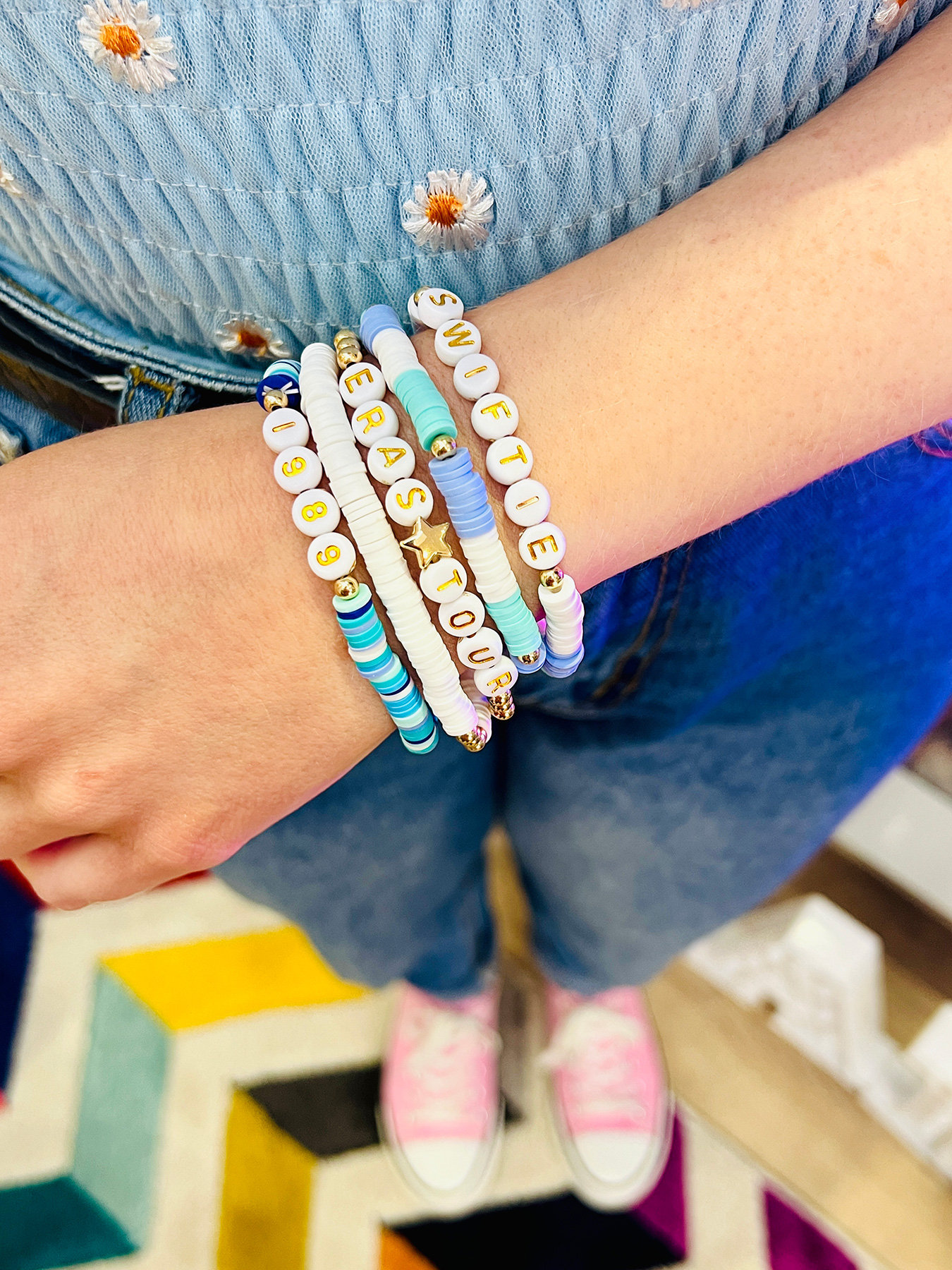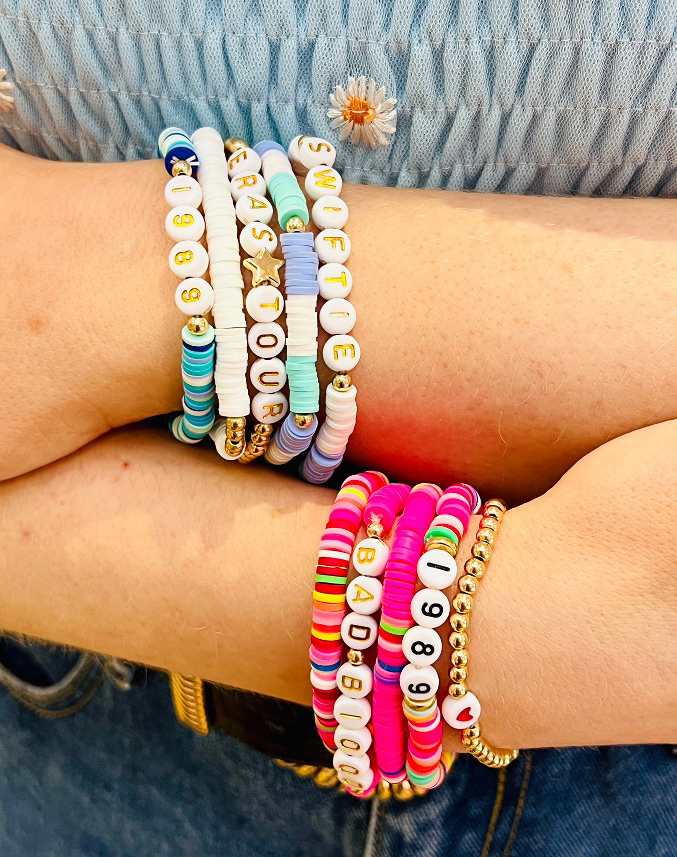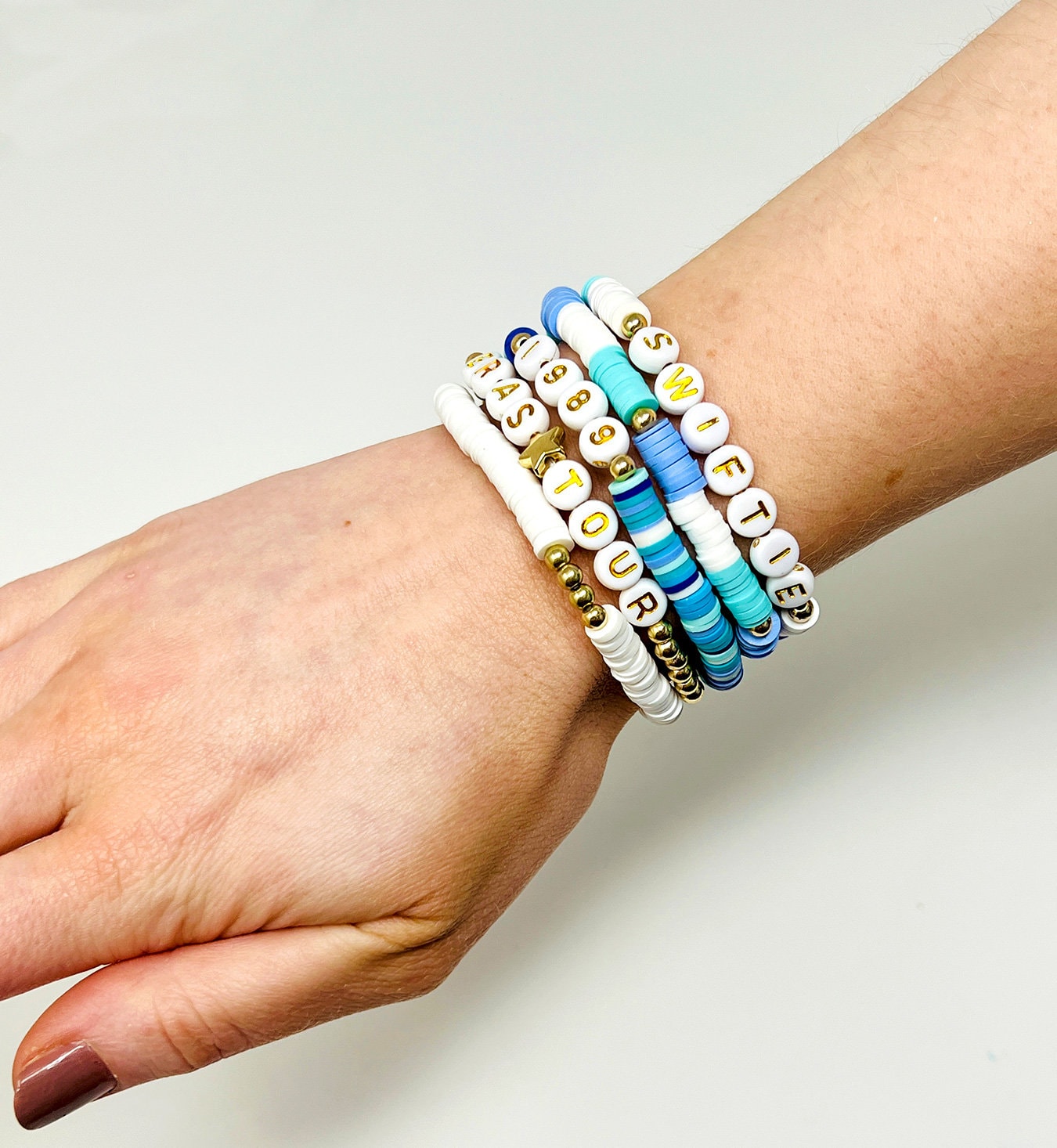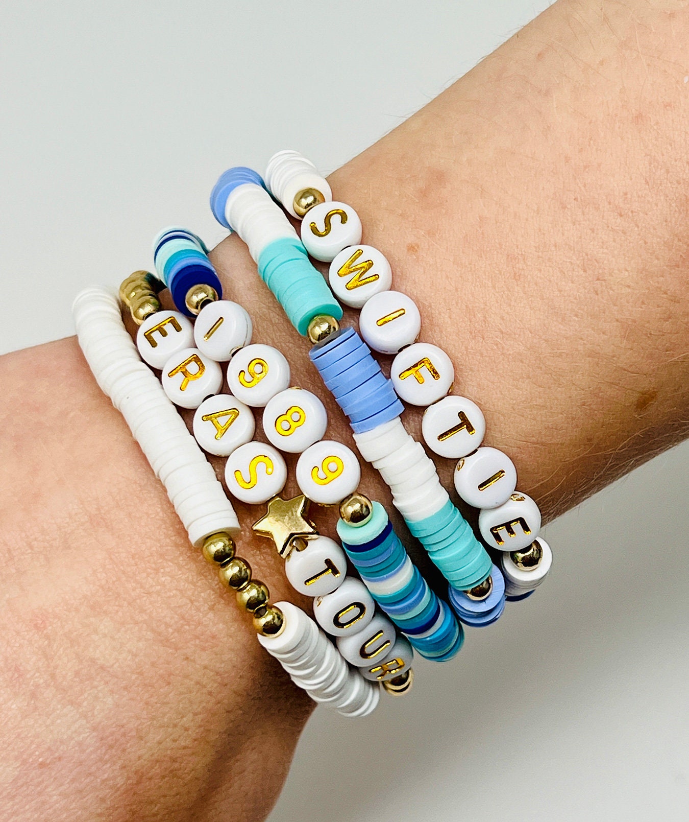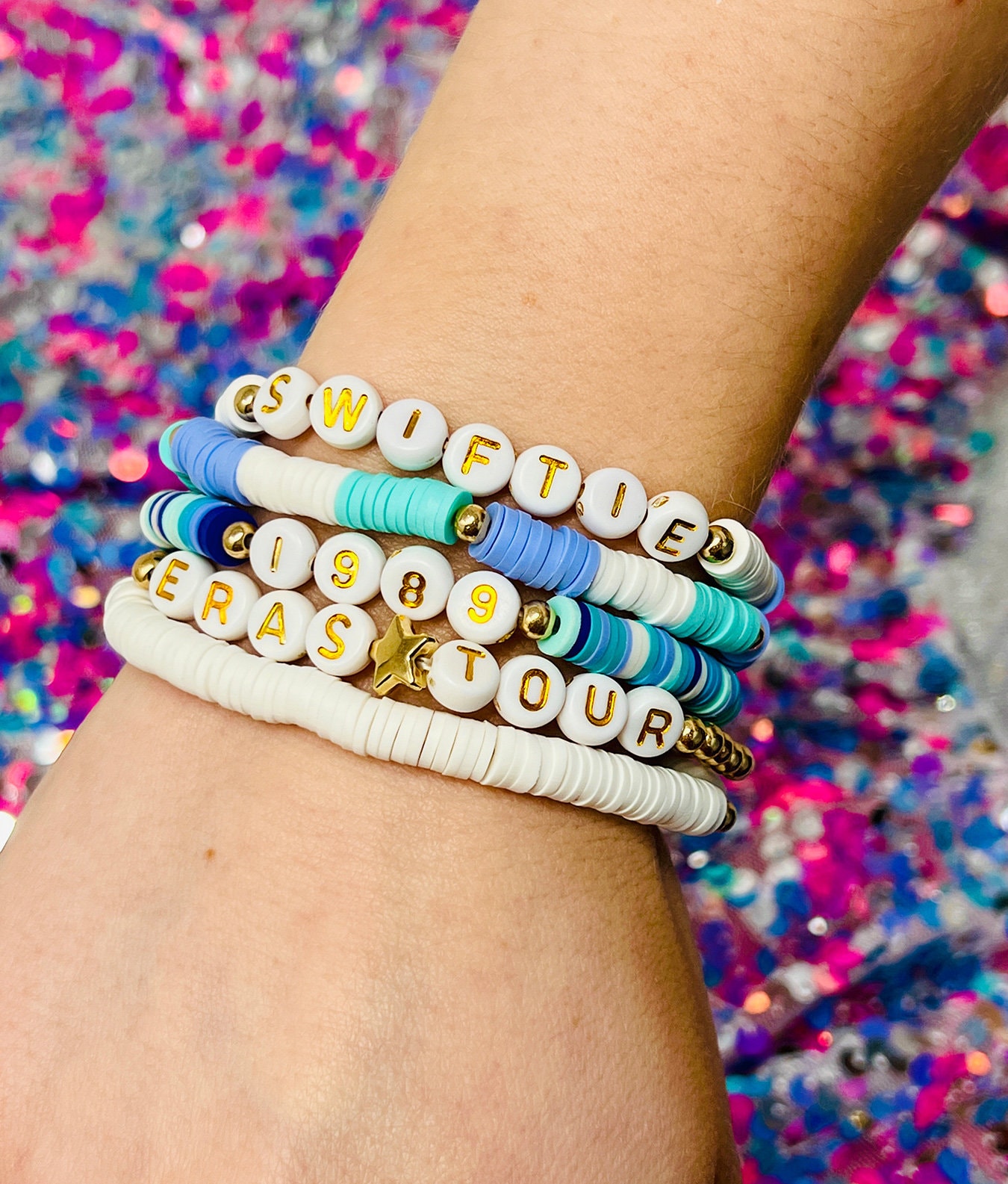 Beautiful 1989 Eras Friendship Bracelets Set perfect for concert goers and TS fans. Includes 5 multicoloured beaded bracelets