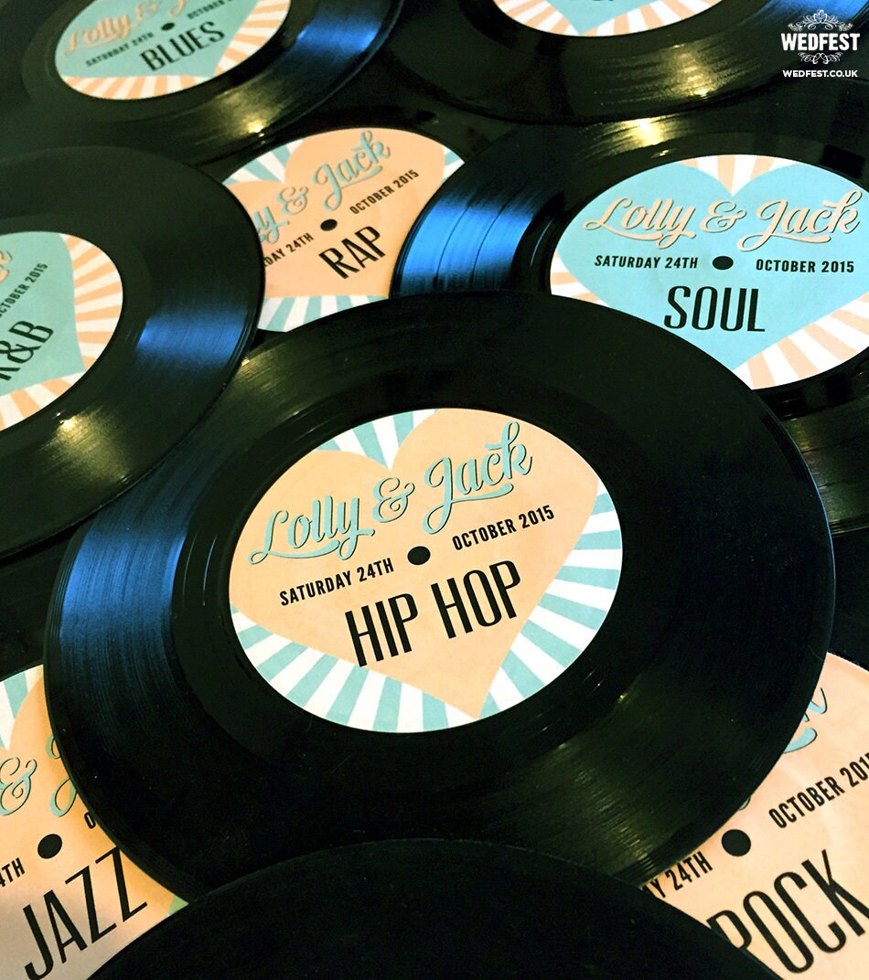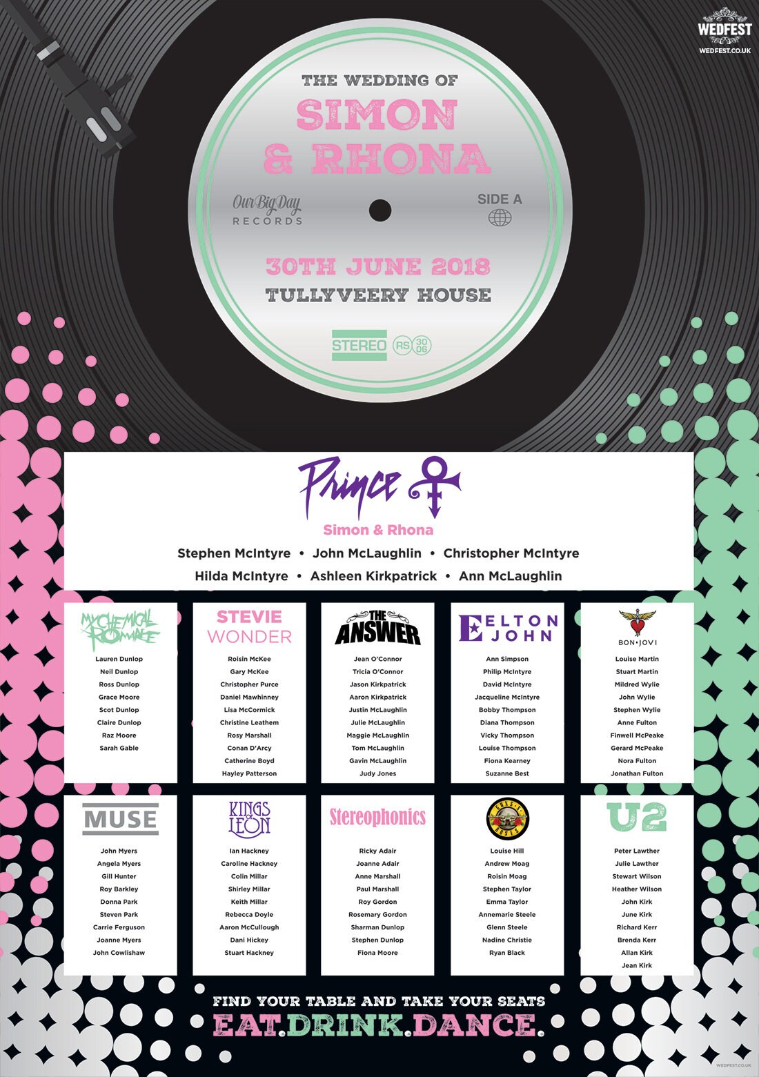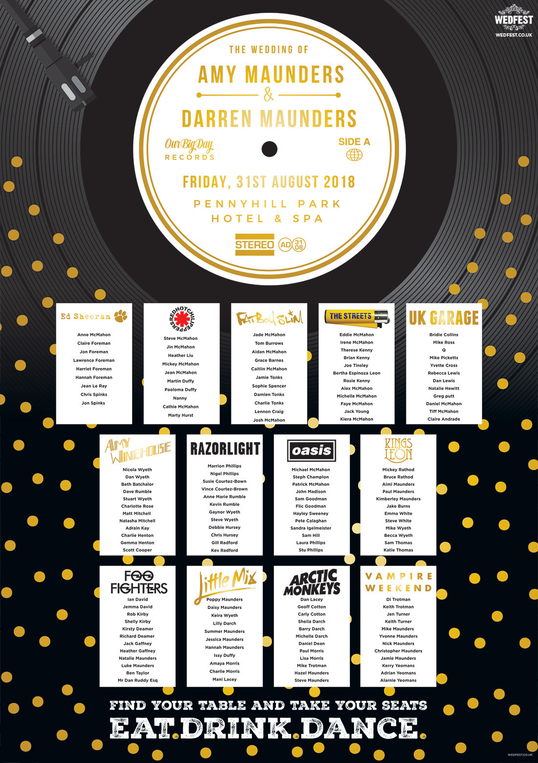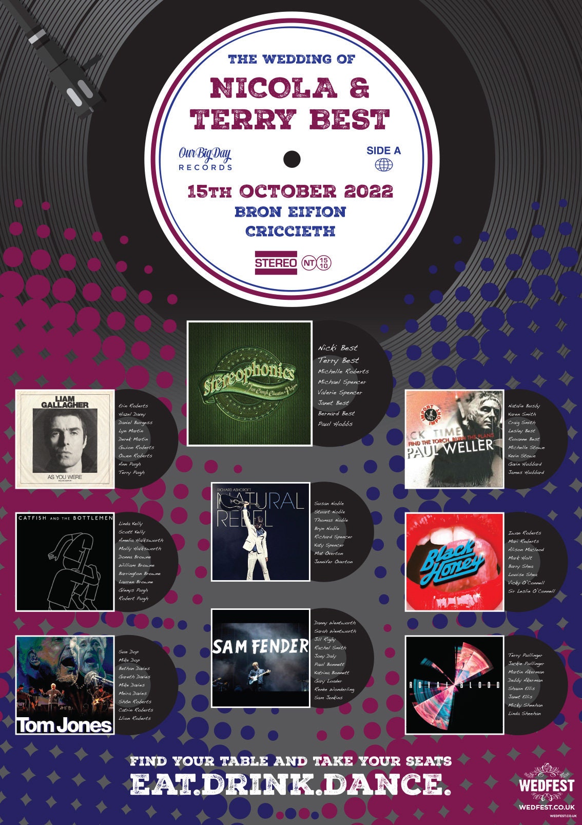 These Vinyl Records Themed Wedding Table plans are a super way to show the world your love of music and retro vinyl records. Then on the big day there is nothing better than to have a massive vinyl record style poster outside your wedding ballroom to direct people to their seats. Some people name their tables after favourite bands, some after favourite songs, the options are unlimited. get in touch with me today and lets discuss ideas...