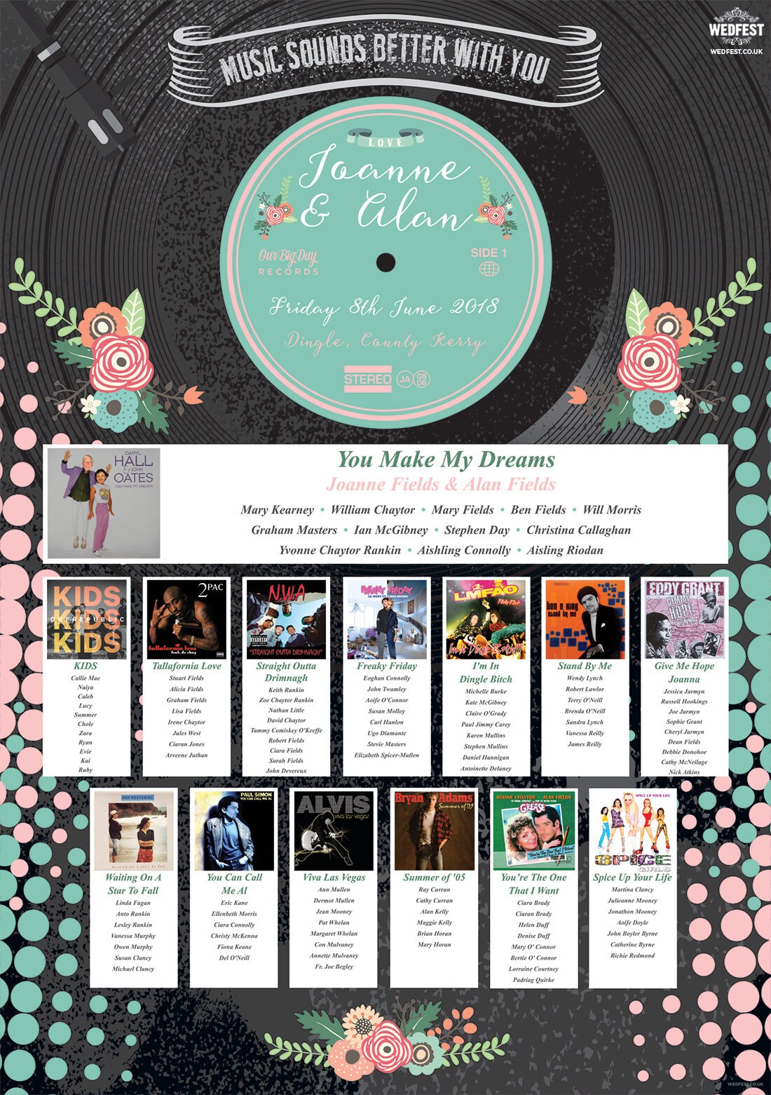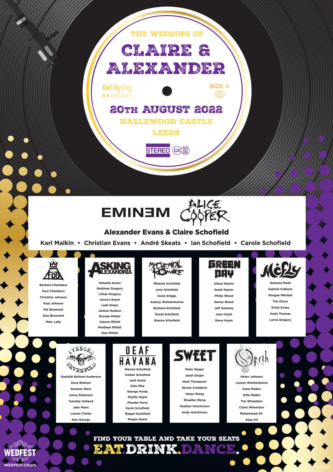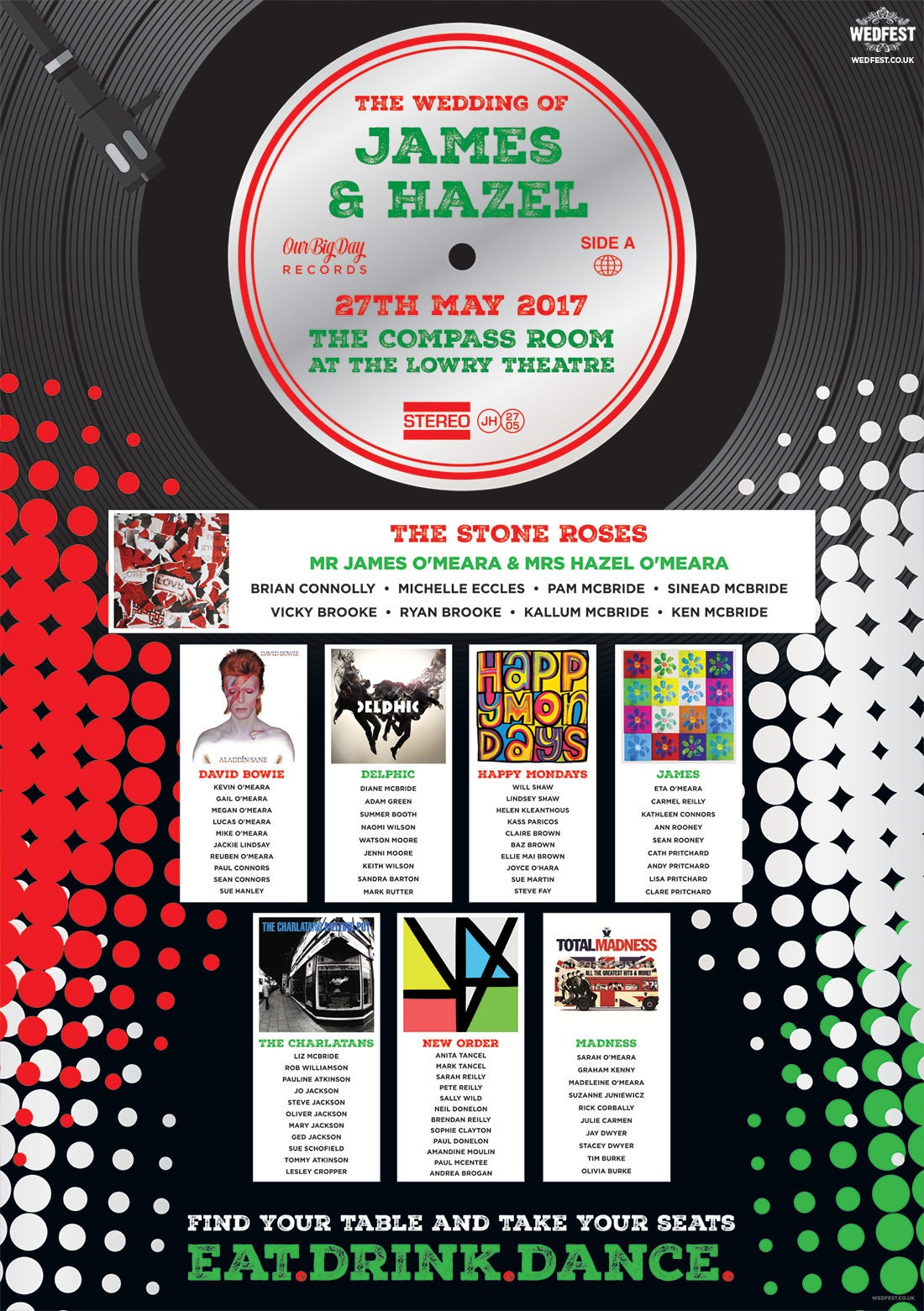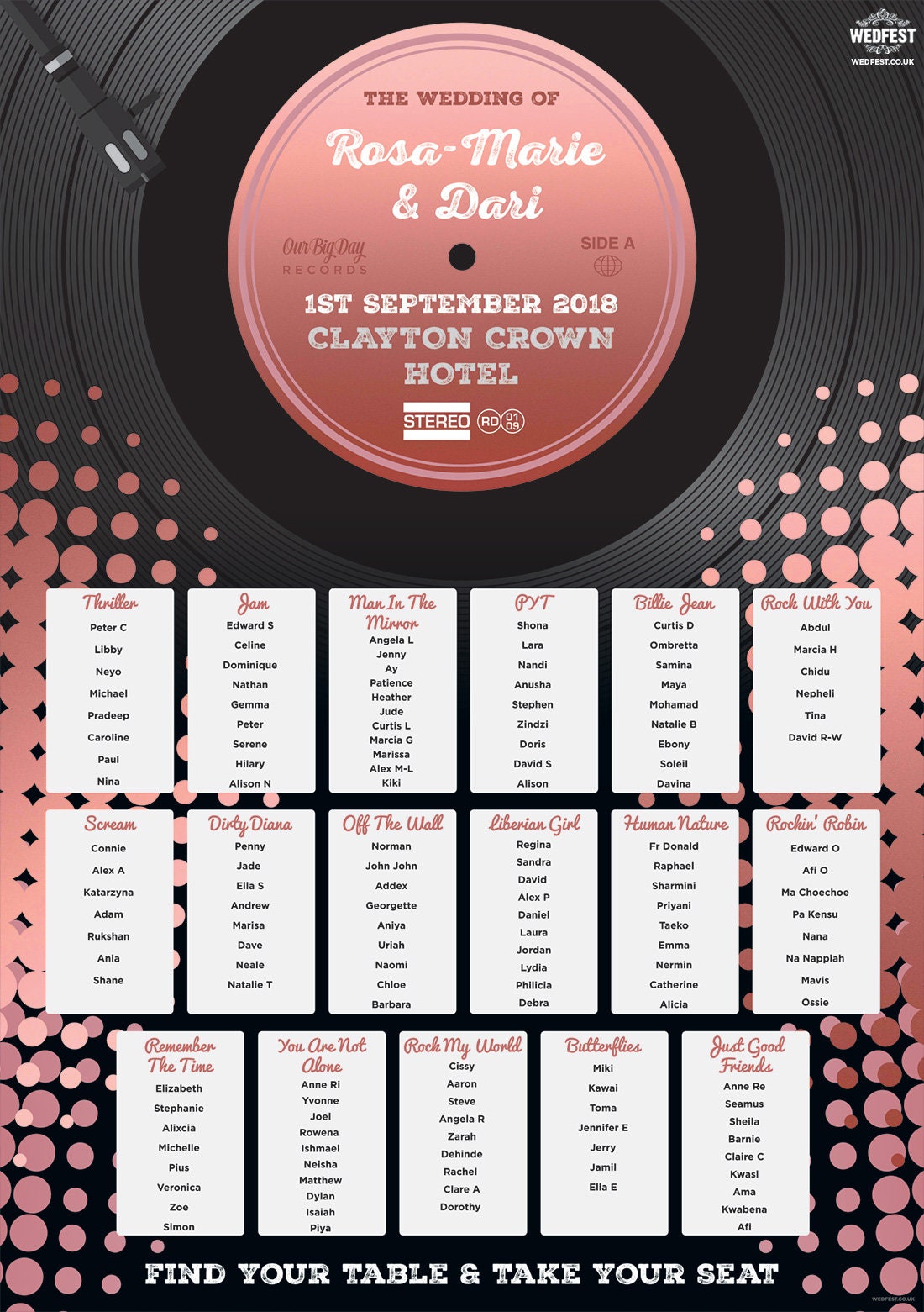 These Vinyl Records Themed Wedding Table plans are a super way to show the world your love of music and retro vinyl records. Then on the big day there is nothing better than to have a massive vinyl record style poster outside your wedding ballroom to direct people to their seats. Some people name their tables after favourite bands, some after favourite songs, the options are unlimited. get in touch with me today and lets discuss ideas...
