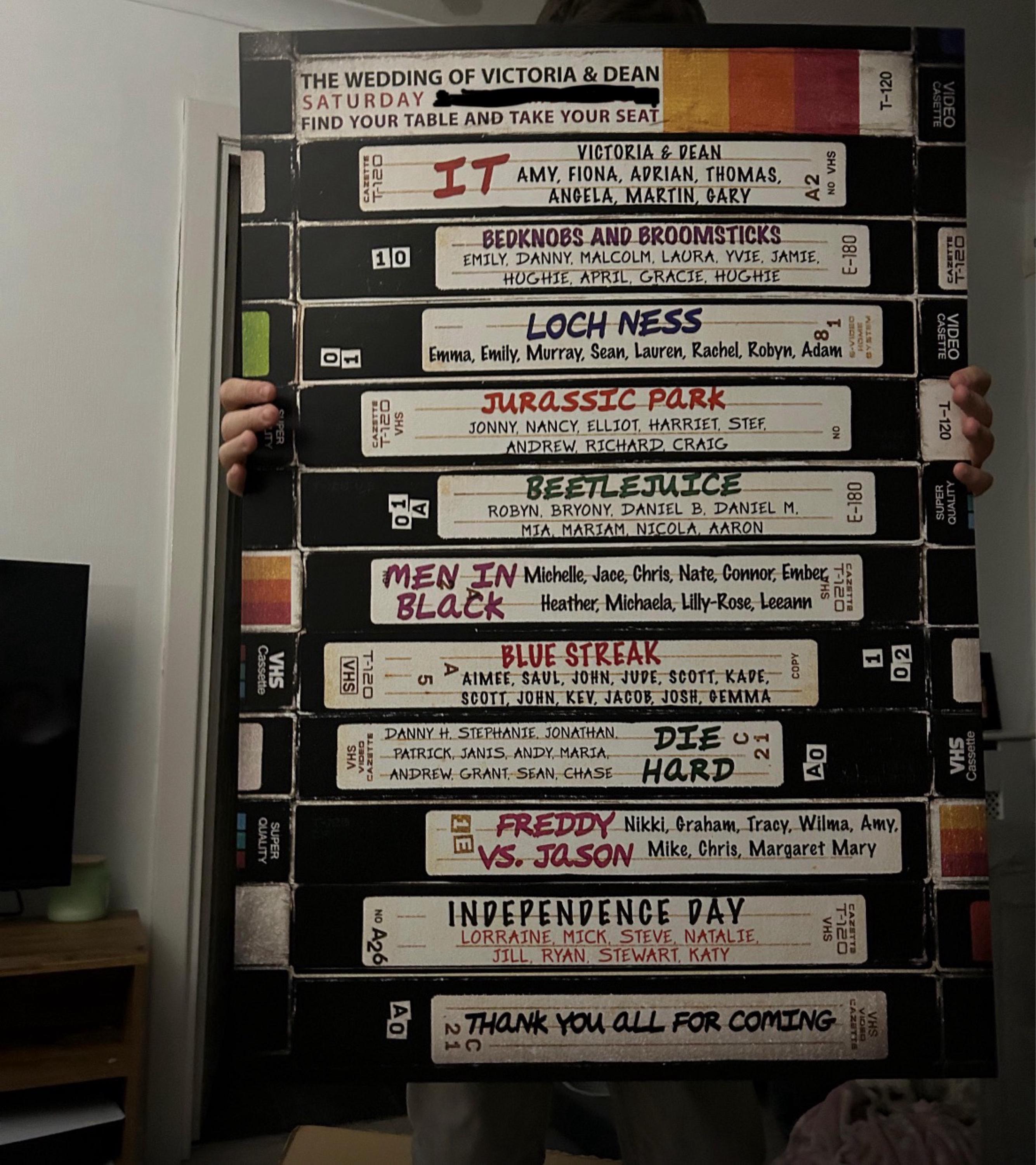 These awesome Retro VHS Themed Wedding Table Plans are perfect for anyone who loves all things retro or a fan of 80s movies and are having a retro themed wedding. Or just anyone who just wants to add a bit of fun to their wedding. The movie names can be changed to suit your favourite movies of your choice.