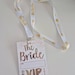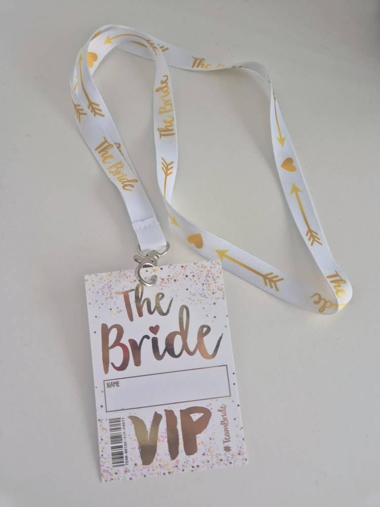 The matching neck lanyard has the text the bride throughout in white and gold.