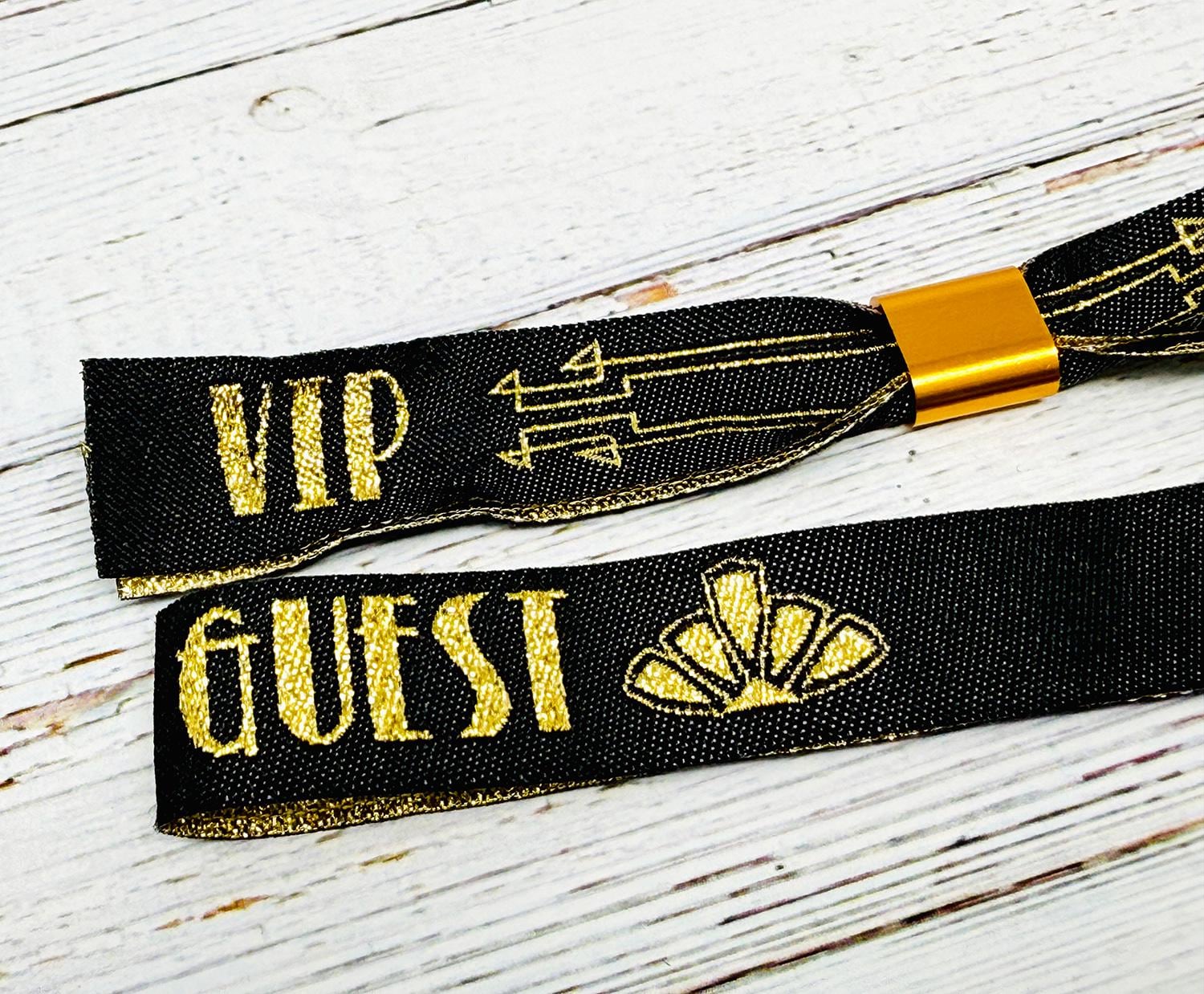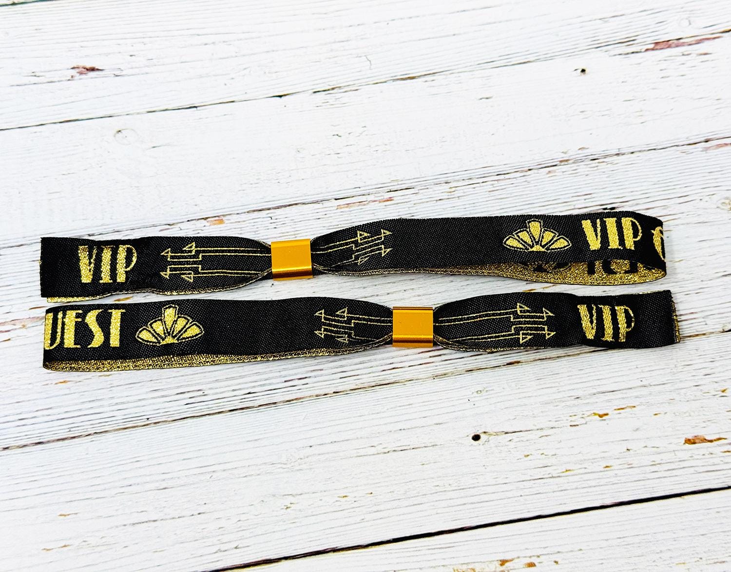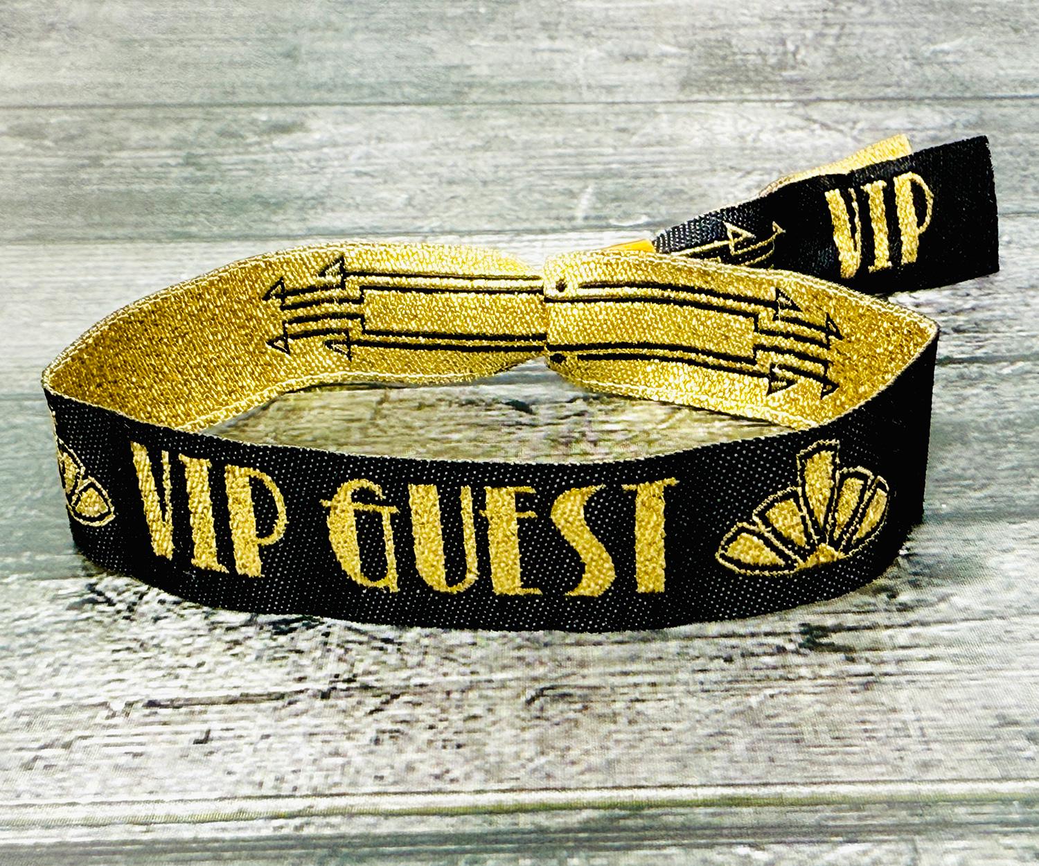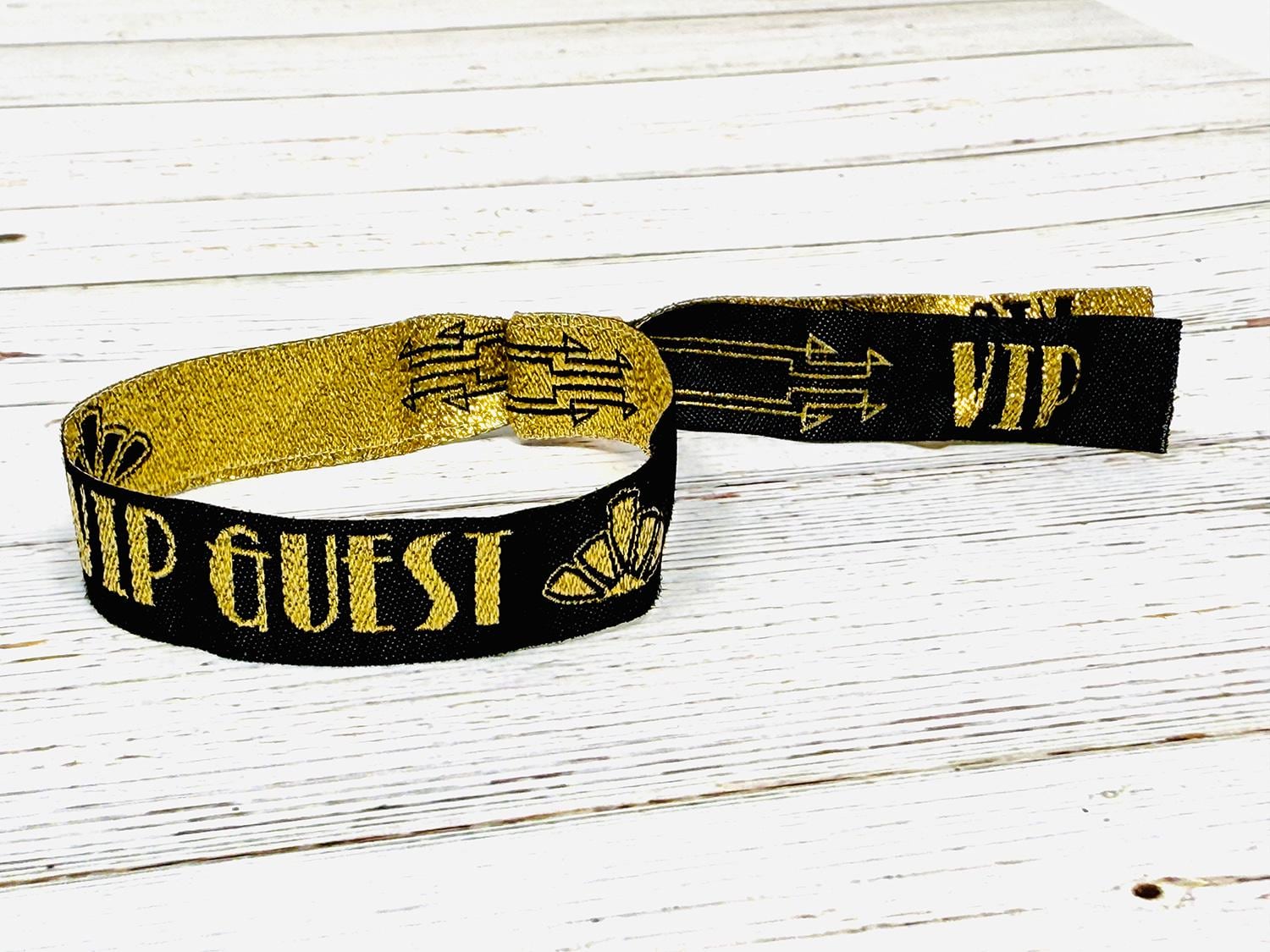 VIP & Guest Branding – The wristbands are adorned with the words “VIP GUEST” in bold gold lettering, with stylish gold arrow detailing and art deco motifs on the tails.