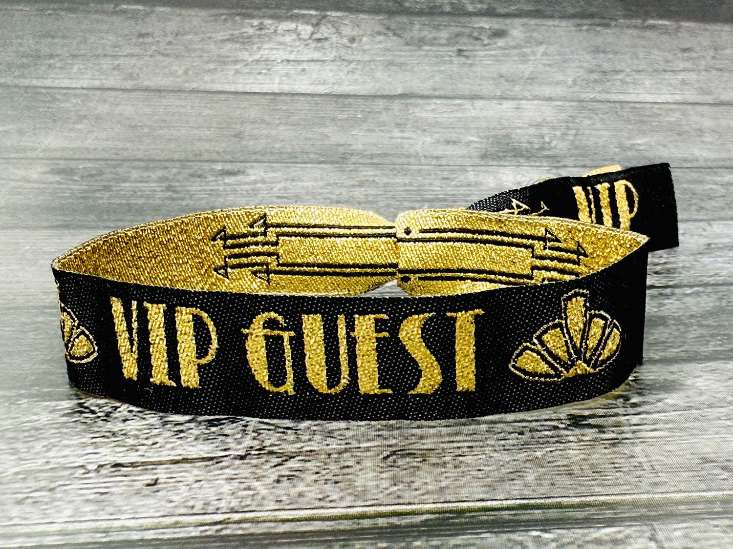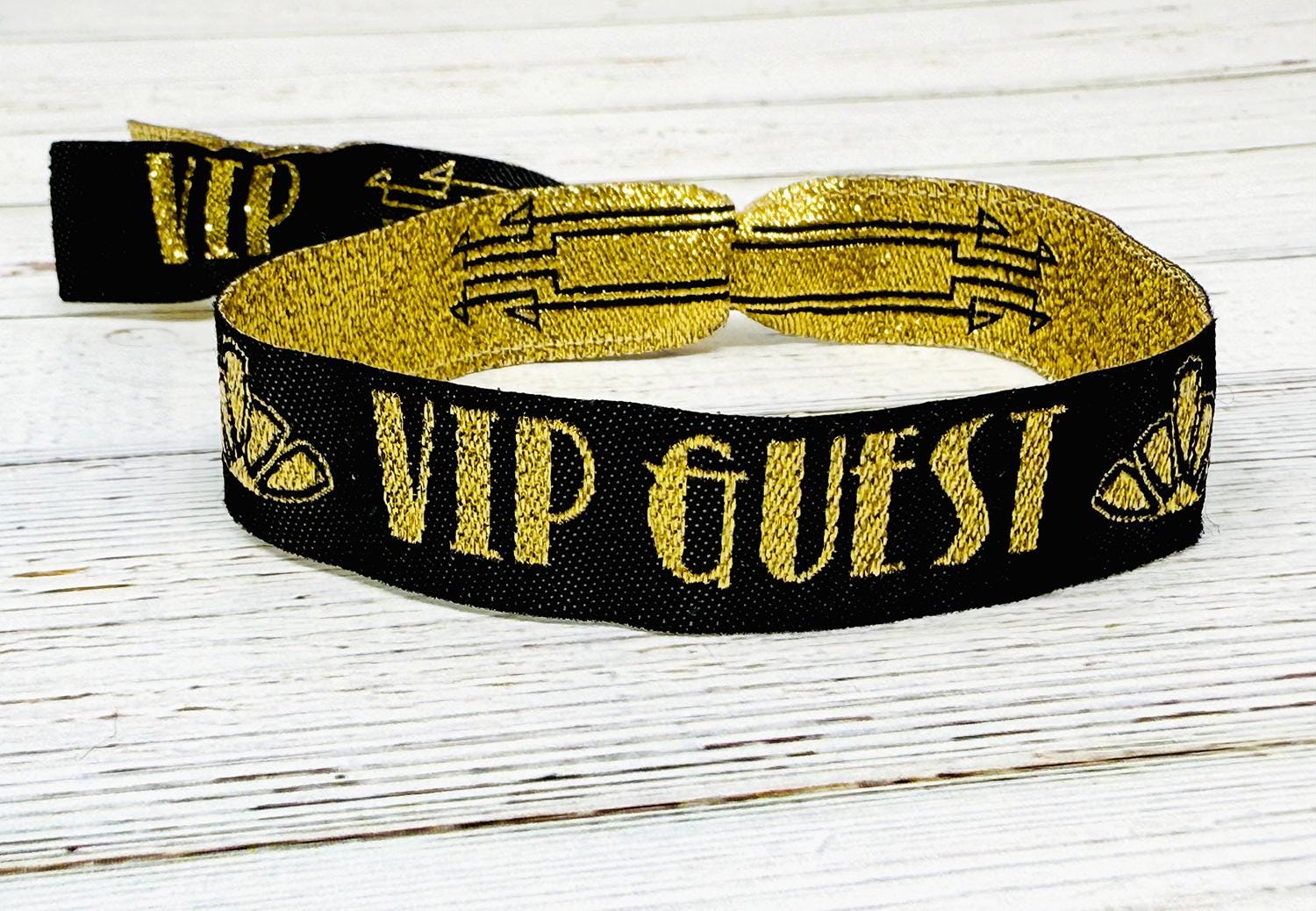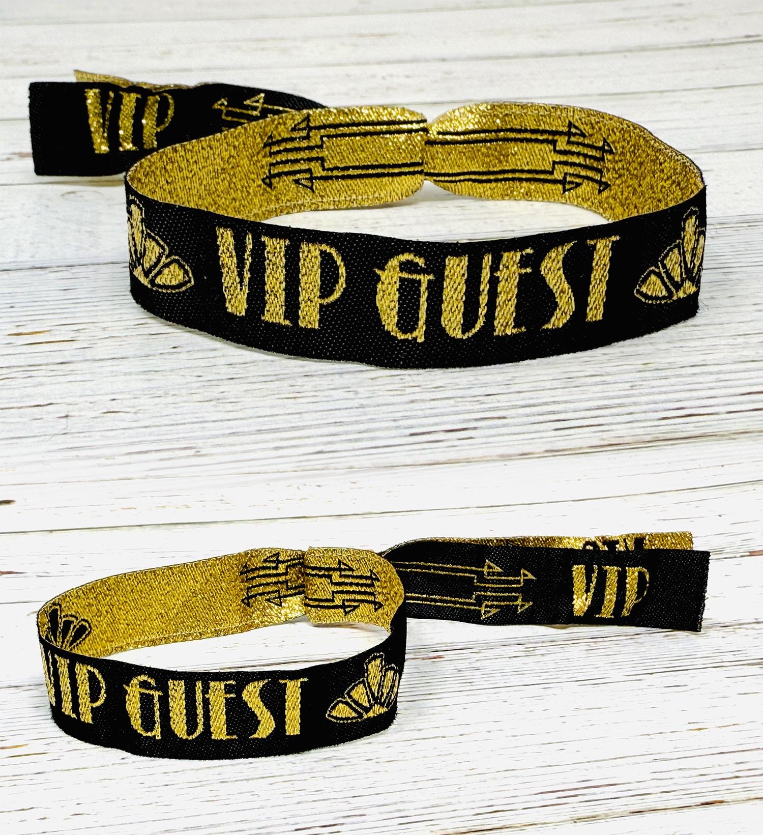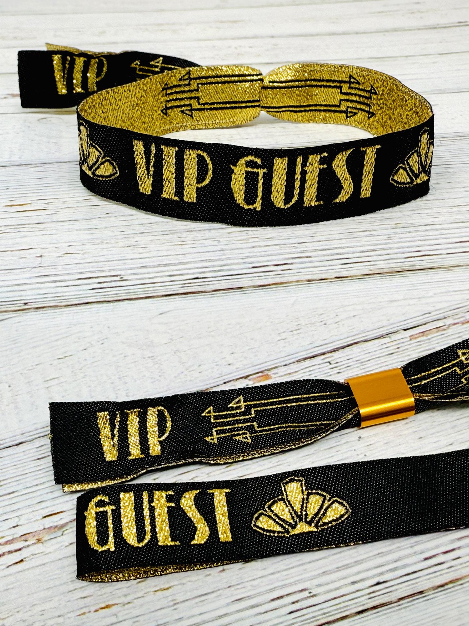 VIP & Guest Branding – The wristbands are adorned with the words “VIP GUEST” in bold gold lettering, with stylish gold arrow detailing and art deco motifs on the tails.