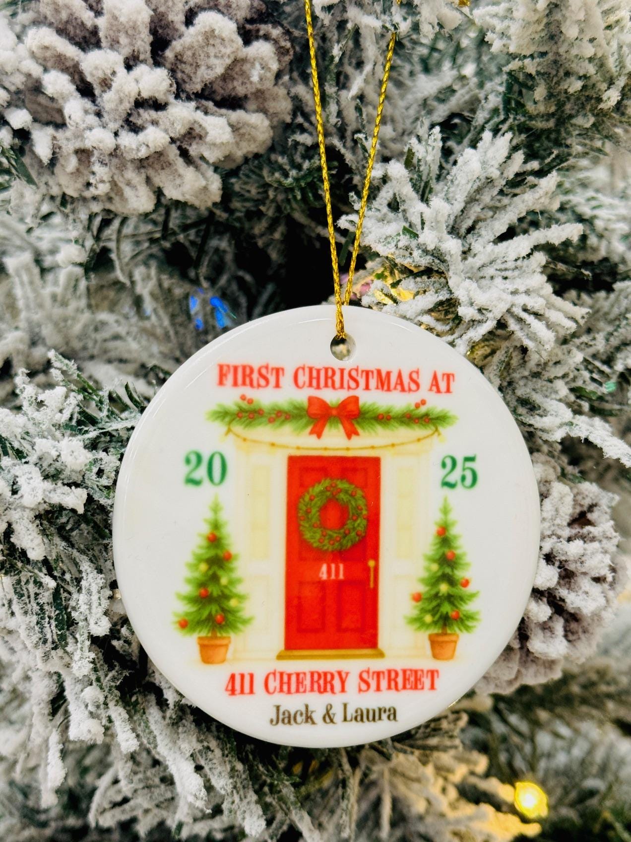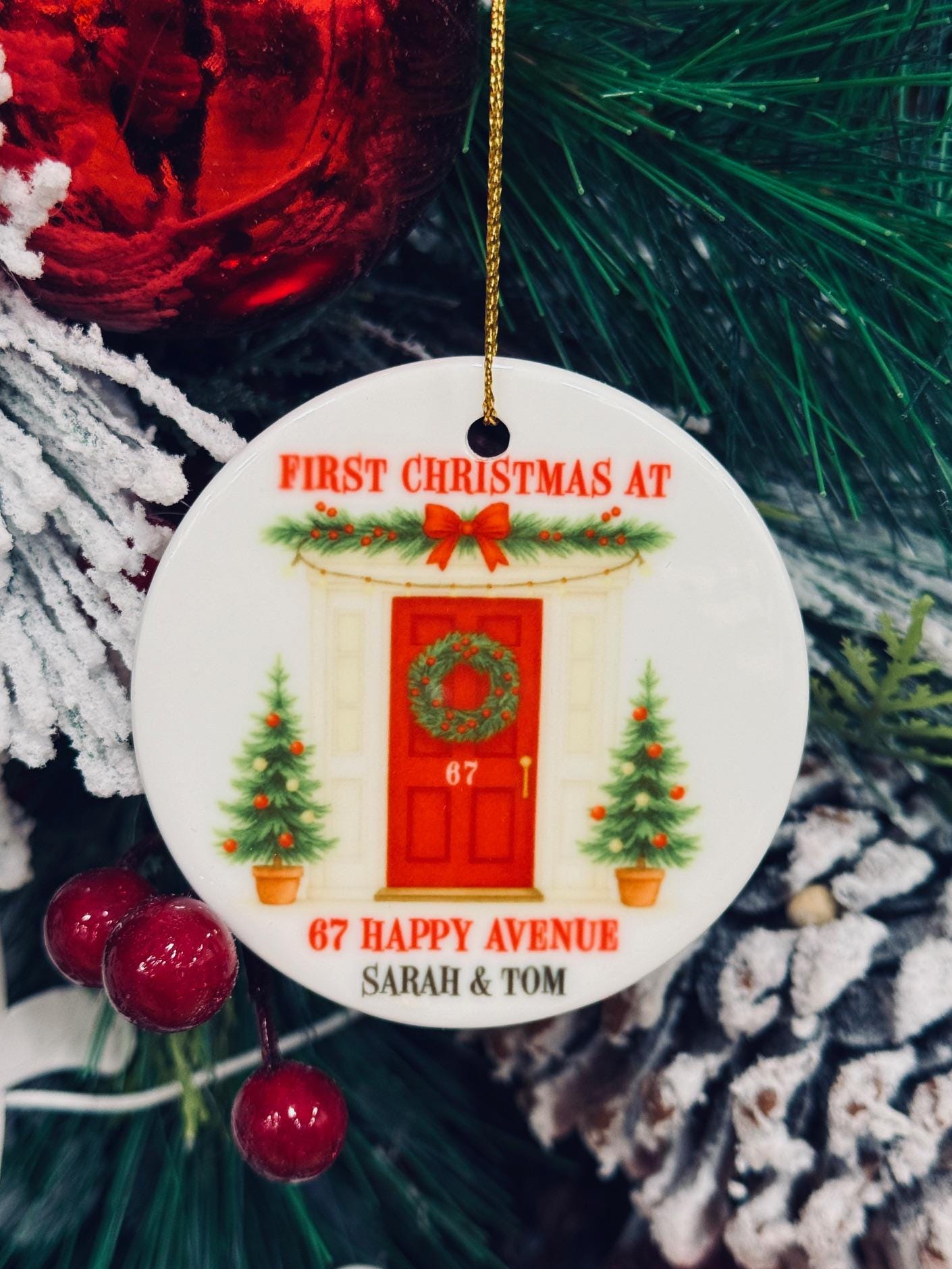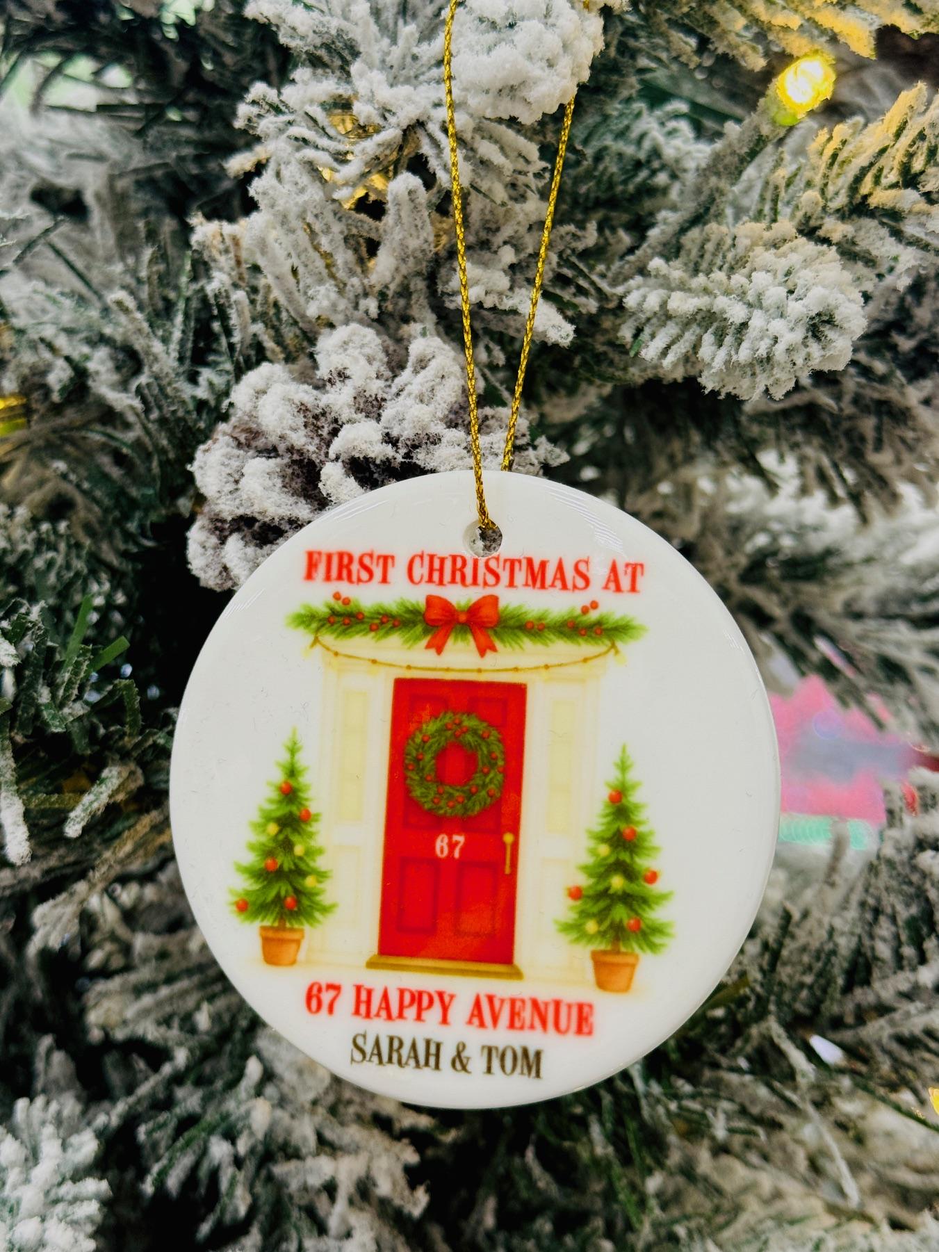 This beautiful personalised ceramic bauble is the perfect festive touch for couples or families celebrating their First Christmas in a New Home. Featuring a charming red front door design, festive greenery, and your custom names and address, this decoration adds a heartfelt and personal touch to your Christmas tree.