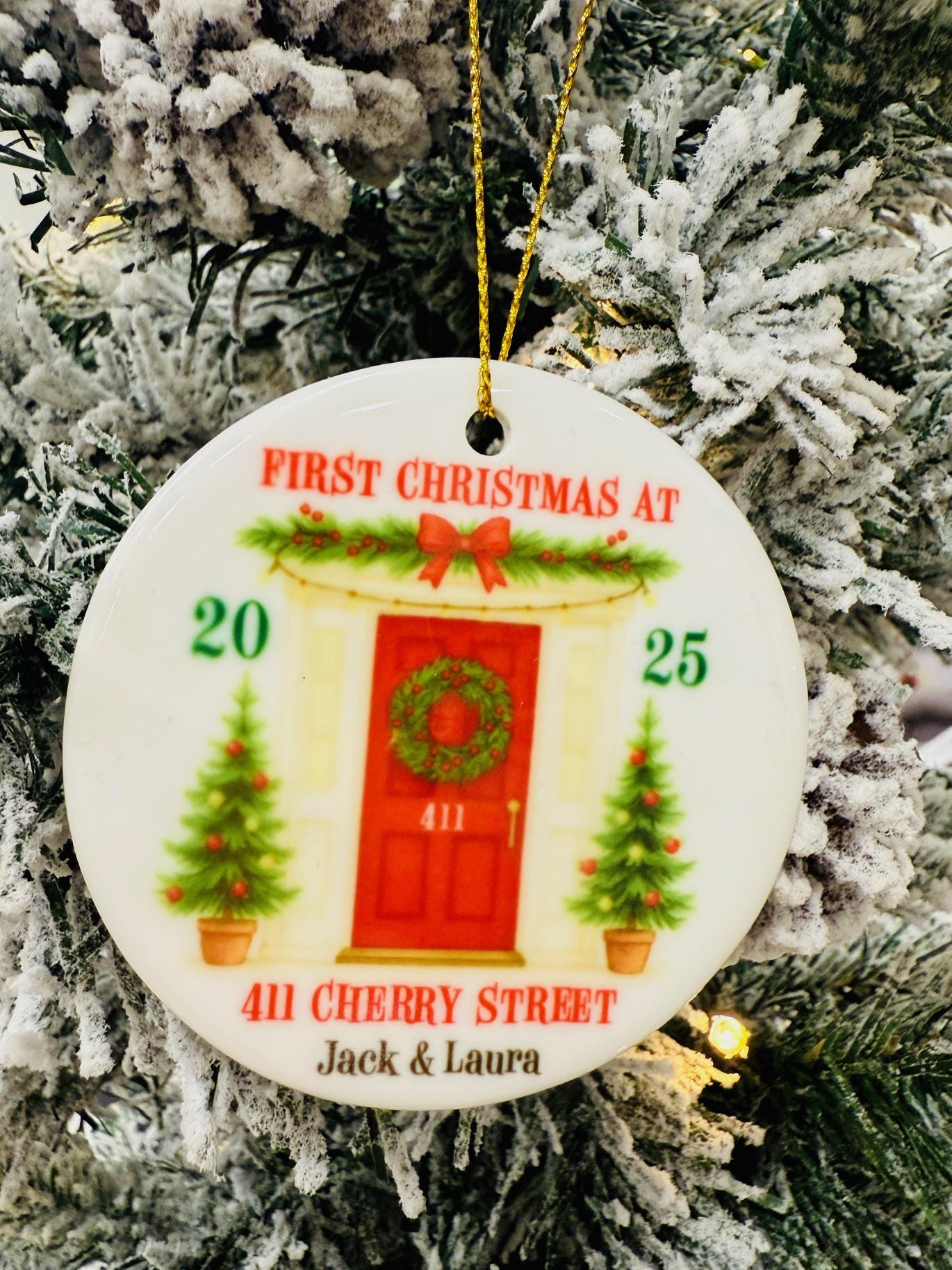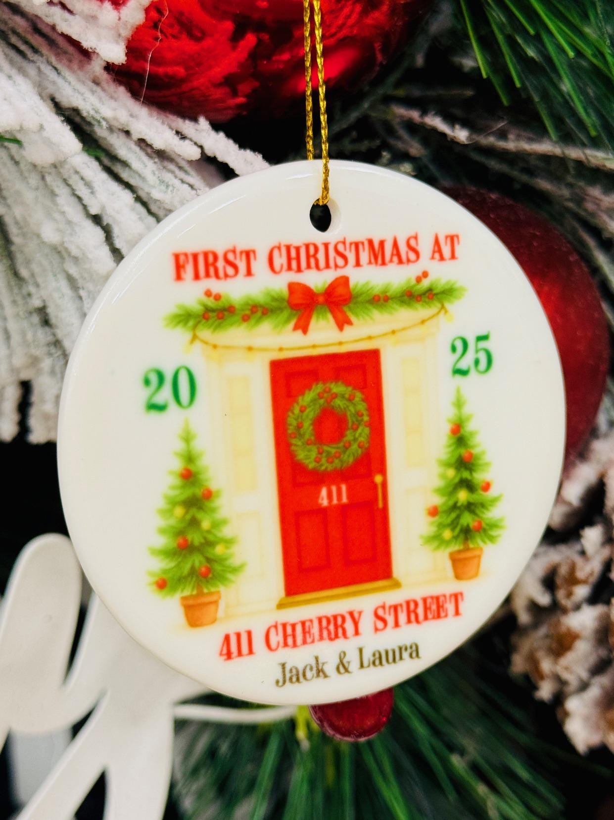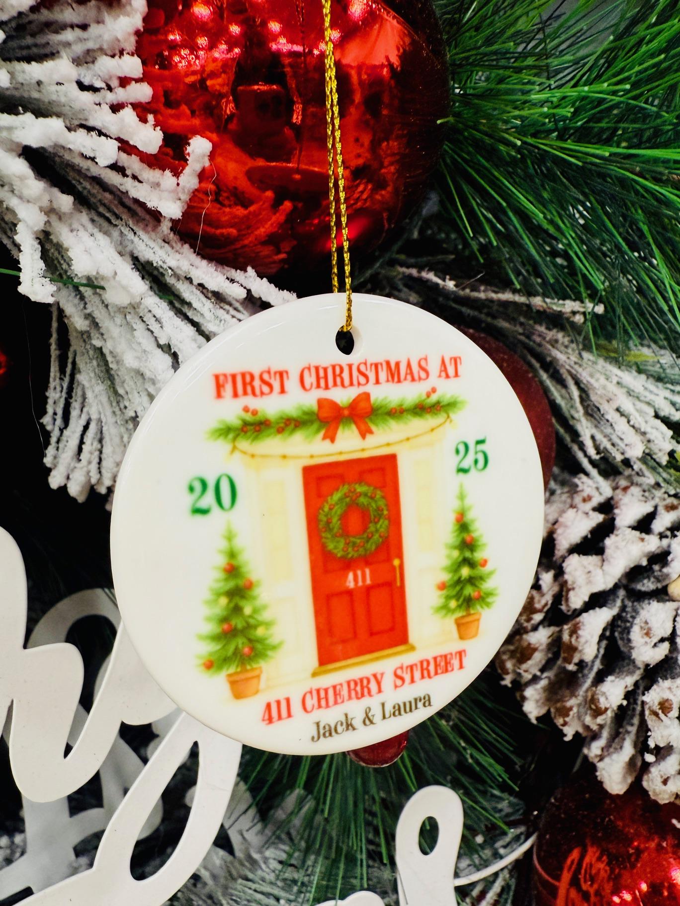 This beautiful personalised ceramic bauble is the perfect festive touch for couples or families celebrating their First Christmas in a New Home. Featuring a charming red front door design, festive greenery, and your custom names and address, this decoration adds a heartfelt and personal touch to your Christmas tree.