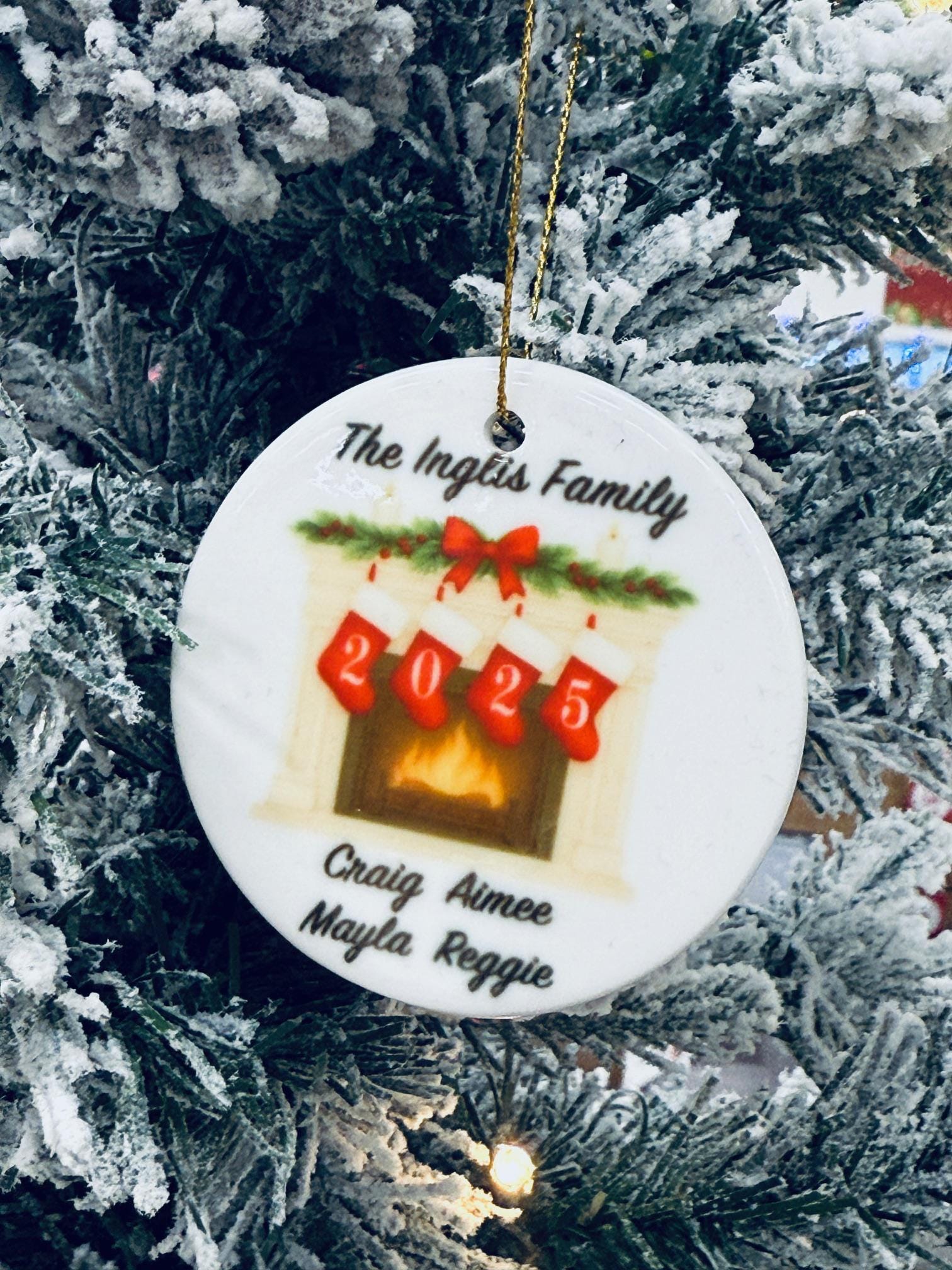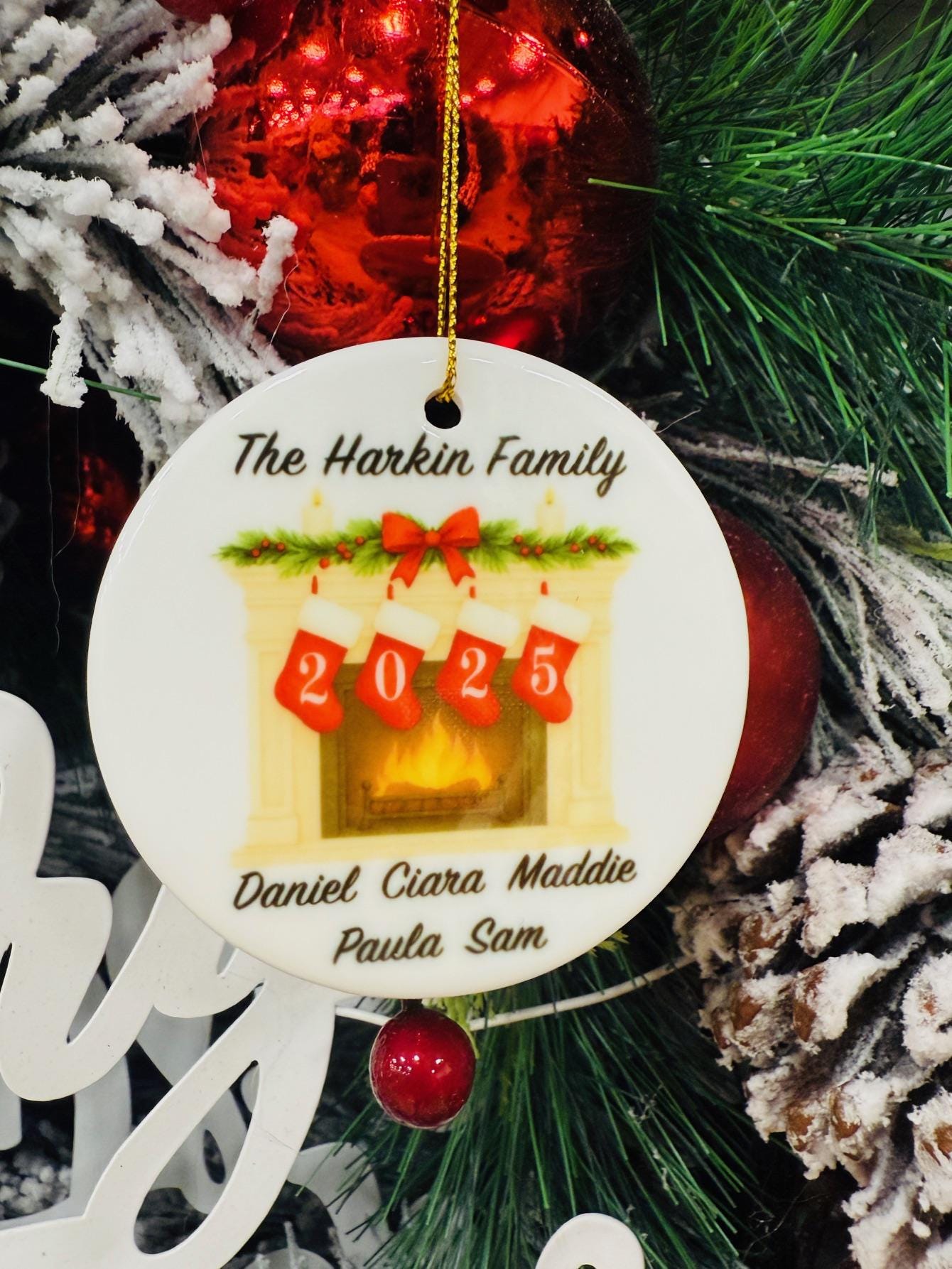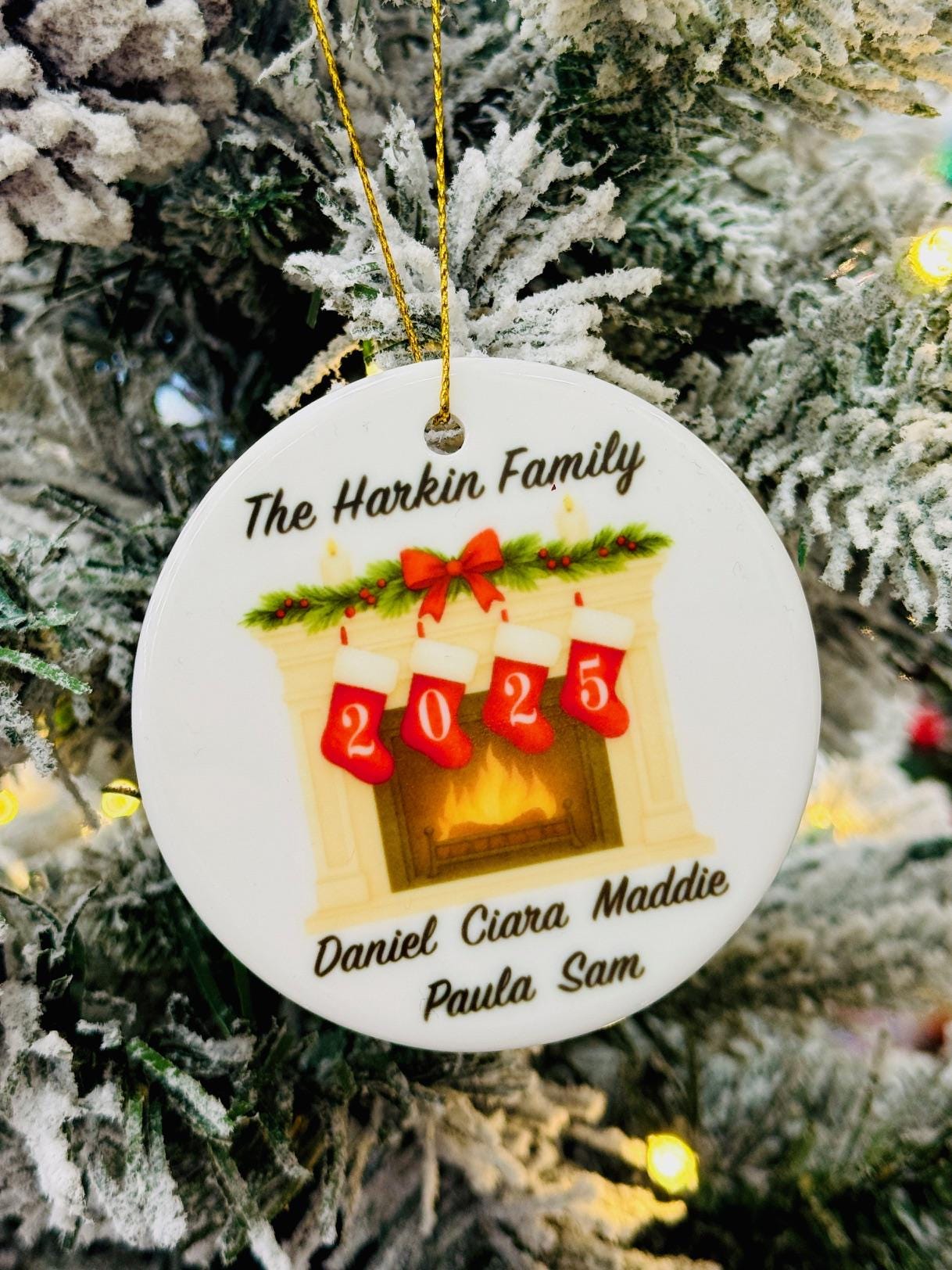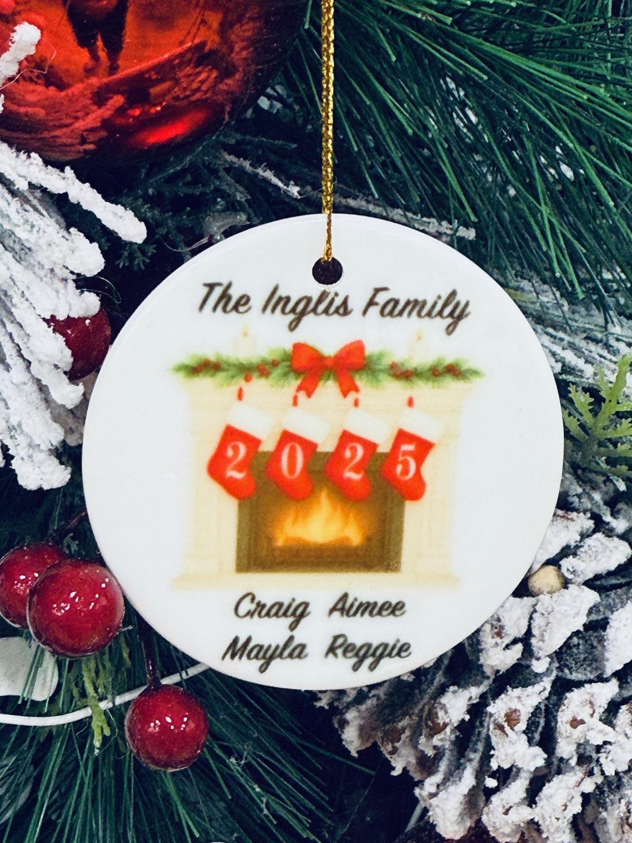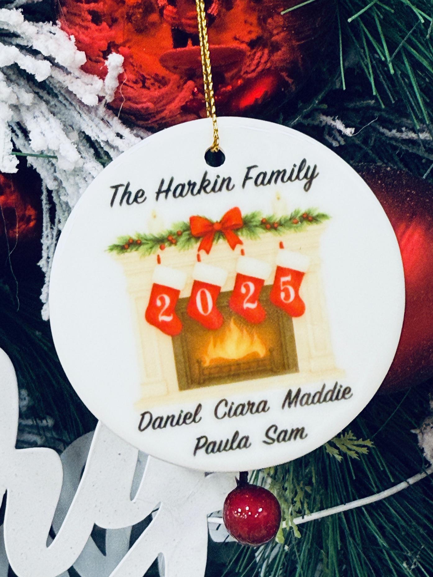 This charming Family Christmas Bauble features a festive fireplace scene complete with stockings hung by the fire — each one representing a member of your family. Personalised with your family name and individual names, this heartwarming ornament is the perfect way to capture the spirit of togetherness this Christmas.