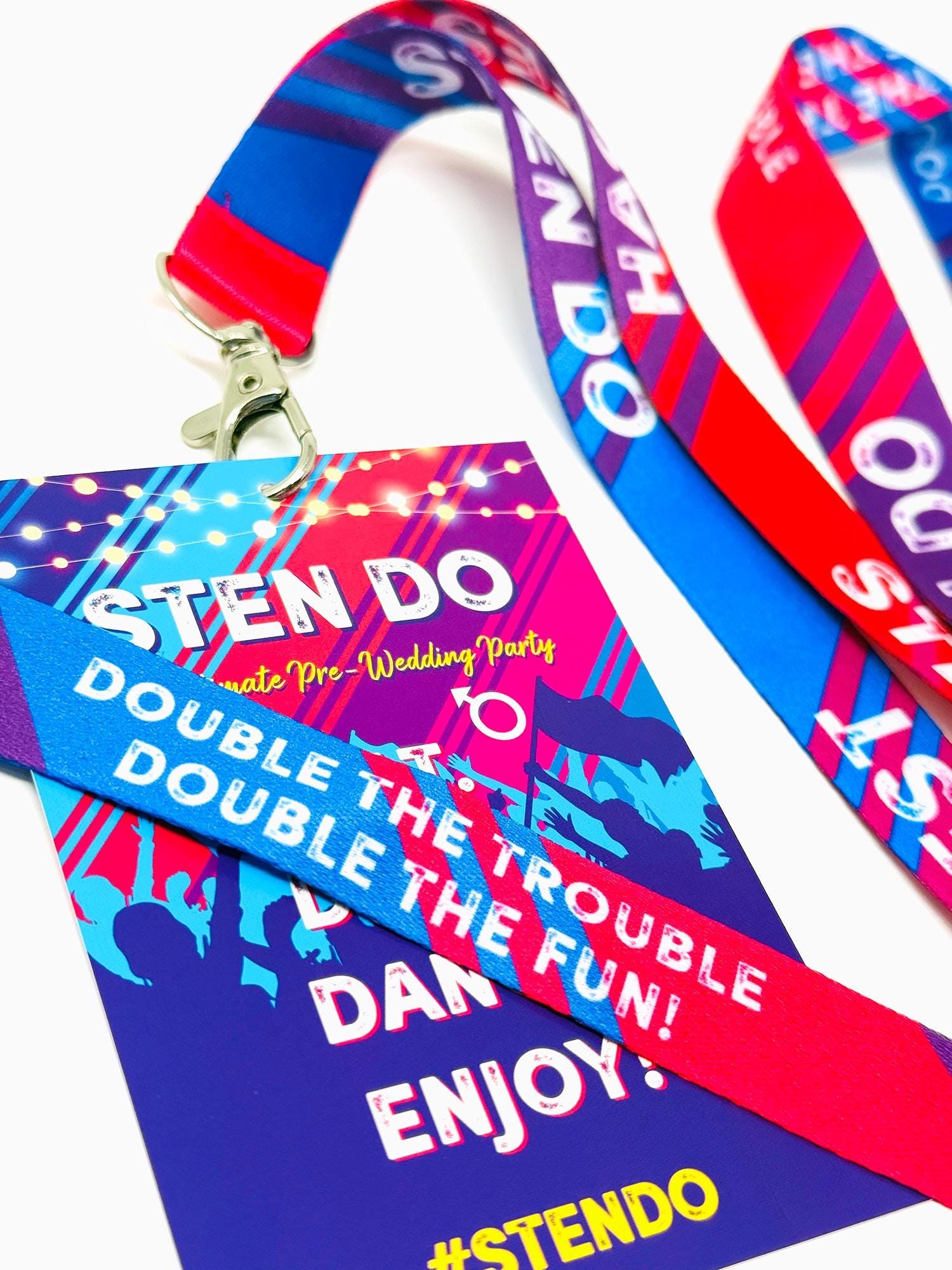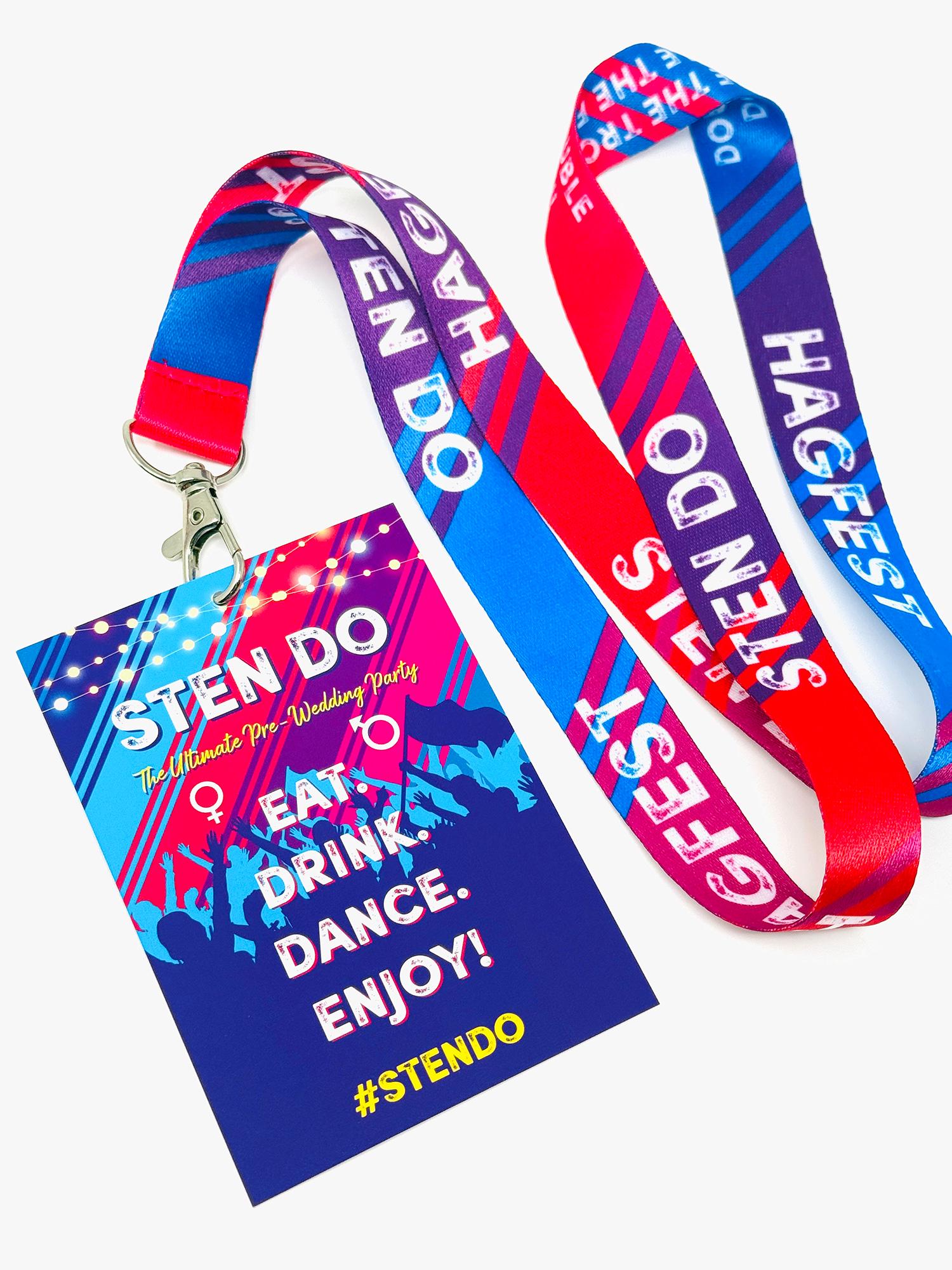 Bring both sides of the wedding party together with our bold, festival-inspired STEN DO joint hen and stag party VIP pass lanyards — the ultimate accessory for a combined pre-wedding celebration. Designed for couples who want to celebrate together, these vibrant festival-style lanyards instantly create a fun, coordinated group look for your weekend, night out, or destination party.
