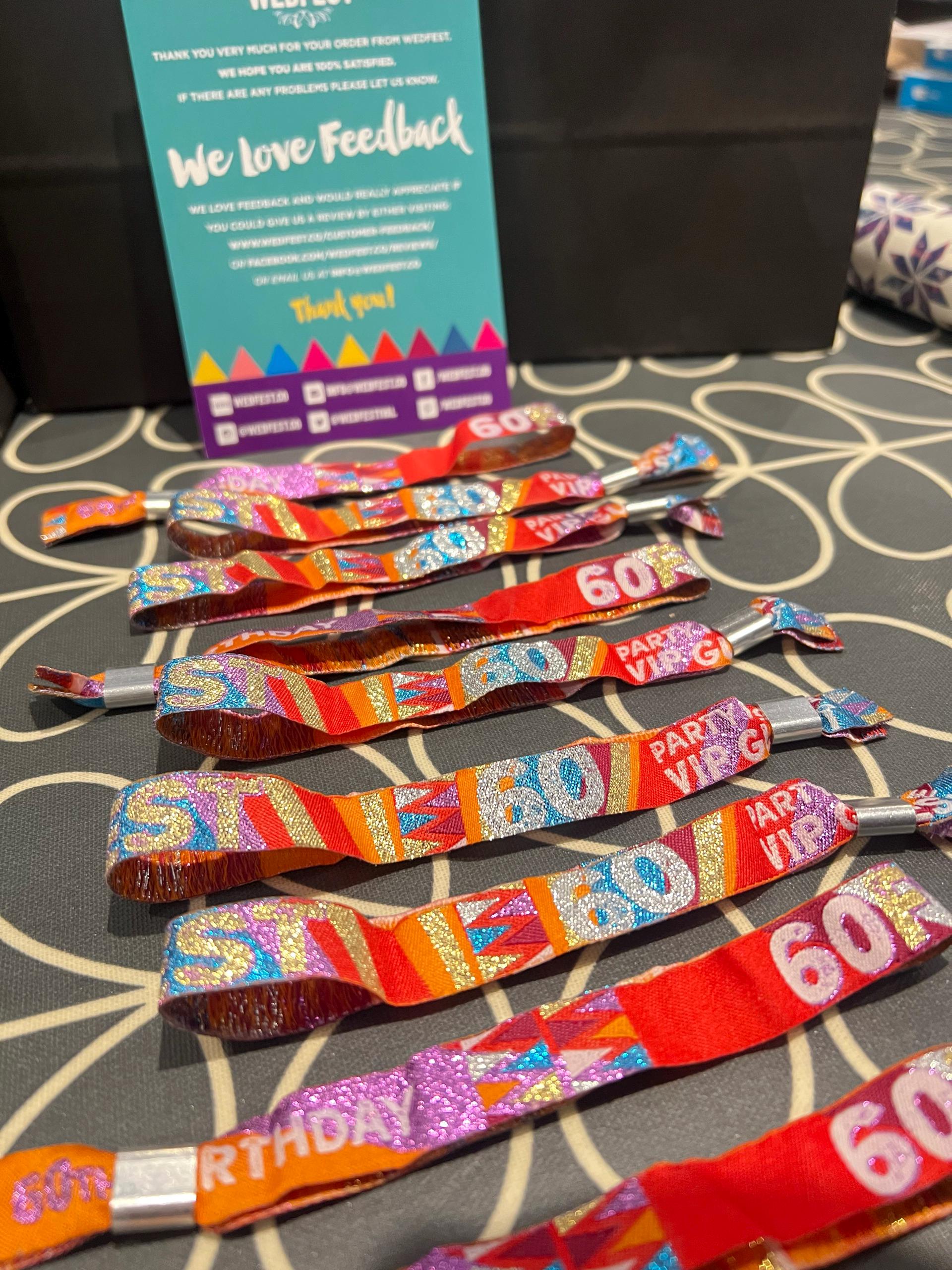 The Wristbands have a festival theme so they are great for anyone wanting to get a small number of festival style wristbands as party favours for their party guests. The text on the wristbands reads 60FEST on the main part of the wristband and PARTY PEOPLE and VIP GUEST on the tails of the wristbands.
